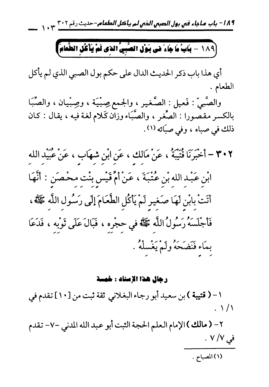 302 - أَخْبَرَنَا قُتَيْبَةُ، عَنْ مَالِكٍ، عَنِ ابْنِ شِهَابٍ، عَنْ عُبَيْدِ اللهِ بْنِ عَبْدِ اللهِ بْنِ عُتْبَةَ، عَنْ أُمِّ قَيْسٍ بِنْتِ مِحْصَنٍ: أَنَّهَا أَتَتْ بِابْنٍ لَهَا صَغِيرٍ لَمْ يَأْكُلِ الطَّعَامَ إِلَى رَسُولِ اللهِ - صلى الله عليه وسلم -، فَأَجْلَسَهُ رَسُولُ اللهِ - صلى الله عليه وسلم - فِي حَجْرِهِ، فَبَالَ عَلَى ثَوْبِهِ، فَدَعَا بِمَاءٍ فَنَضَحَهُ وَلَمْ يَغْسِلْهُ.
