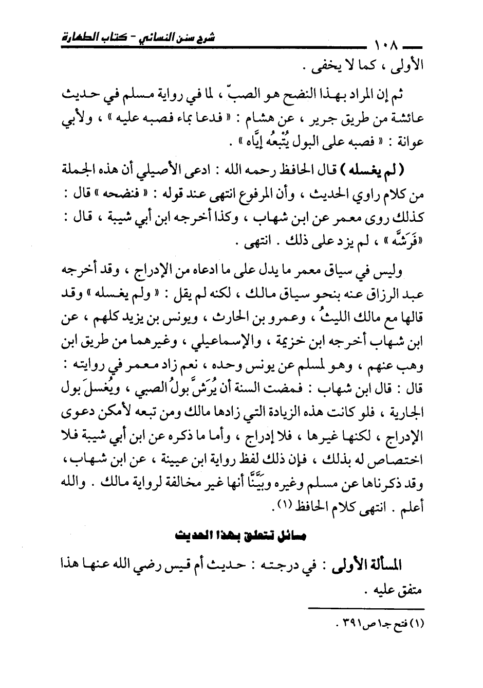 وليس في سياق معمر ما يدل على ما ادعاه من الإدراج، وقد أخرجه عبد الرزاق عنه بنحو سياق مالك، لكنه لم يقل: "ولم يغسله" وقد قالها مع مالك الليثُ، وعمرو بن الحارث، ويونس بن يزيد كلهم، عن ابن شهاب أخرجه ابن خزيمة، والإسماعيلي، وغيرهما من طريق ابن وهب عنهم، وهو لمسلم عن يونس وحده، نعم زاد معمر في روايته: قال: قال ابن شهاب: فمضت السنة أن يُرَشَّ بولُ الصبي، ويُغسلَ بول الجارية، فلو كانت هذه الزيادة التي زادها مالك ومن تبعه لأمكن دعوى الإدراج، لكنها غيرها، فلا إدراج، وأما ما ذكره عن ابن أبي شيبة فلا اختصاص له بذلك، فإن ذلك لفظ رواية ابن عيينة، عن ابن شهاب، وقد ذكرناها عن مسلم وغيره وبَيَّنَّا أنها غير مخالفة لرواية مالك. والله أعلم. انتهى كلام الحافظ (¬1).
