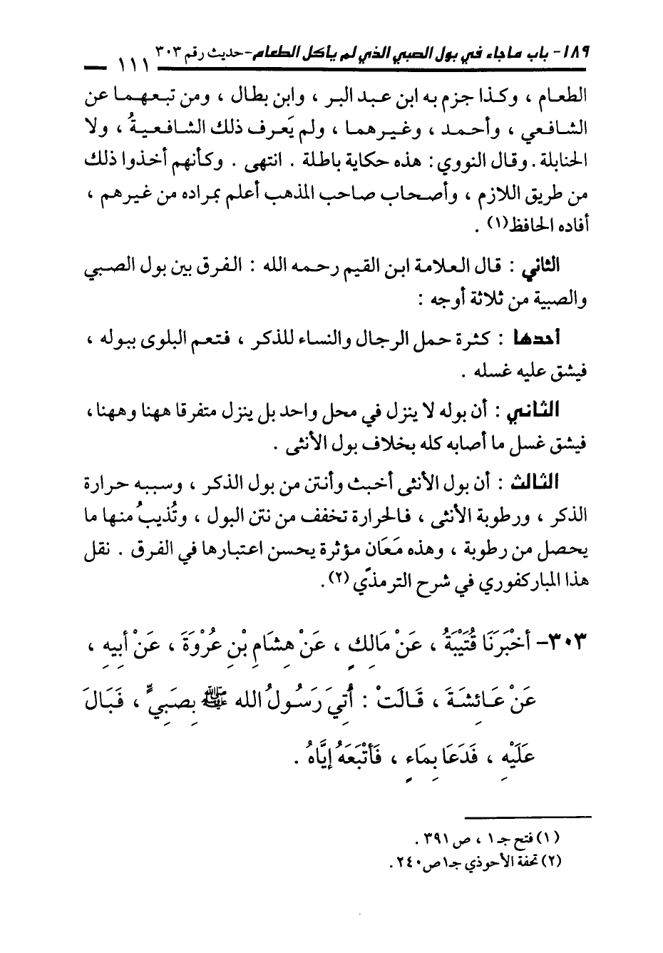 303 - أَخْبَرَنَا قُتَيْبَةُ، عَنْ مَالِكٍ، عَنْ هِشَامِ بْنِ عُرْوَةَ، عَنْ أَبِيهِ، عَنْ عَائِشَةَ، قَالَتْ: أُتِيَ رَسُولُ اللهِ - صلى الله عليه وسلم - بِصَبِيٍّ، فَبَالَ عَلَيْهِ، فَدَعَا بِمَاءٍ، فَأَتْبَعَهُ إِيَّاهُ.