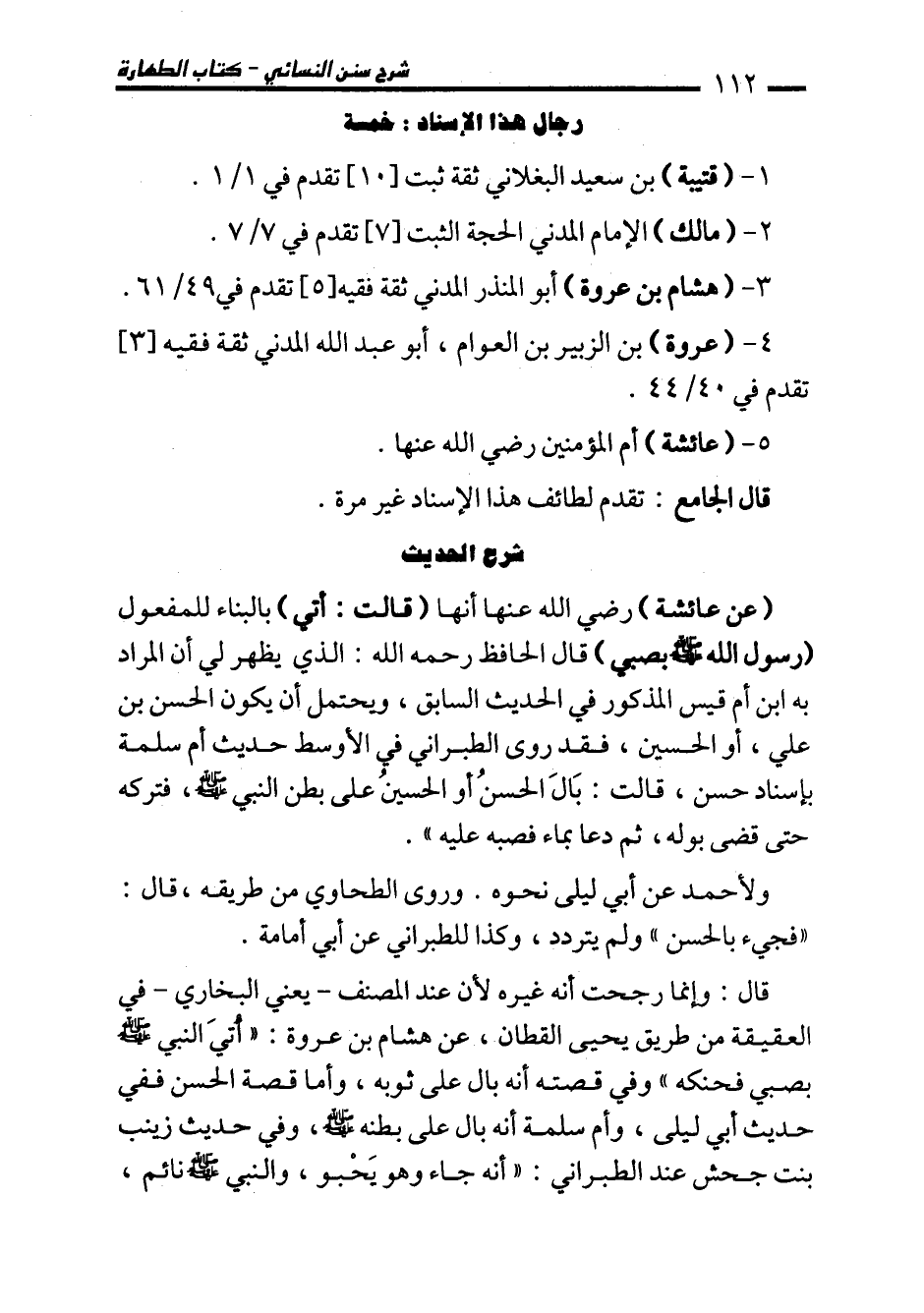 قال: وإنما رجحت أنه غيره لأن عند المصنف -يعني البخاري- في العقيقة من طريق يحيى القطان، عن هشام بن عروة: "أُتيَ النبي - صلى الله عليه وسلم - بصبي فحنكه" وفي قصته أنه بال على ثوبه، وأما قصة الحسن ففي حديث أبي ليلى، وأم سلمة أنه بال على بطنه - صلى الله عليه وسلم -، وفي حديث زينب بنت جحش عند الطبراني: "أنه جاء وهو يَحْبو، والنبي - صلى الله عليه وسلم - نائم،