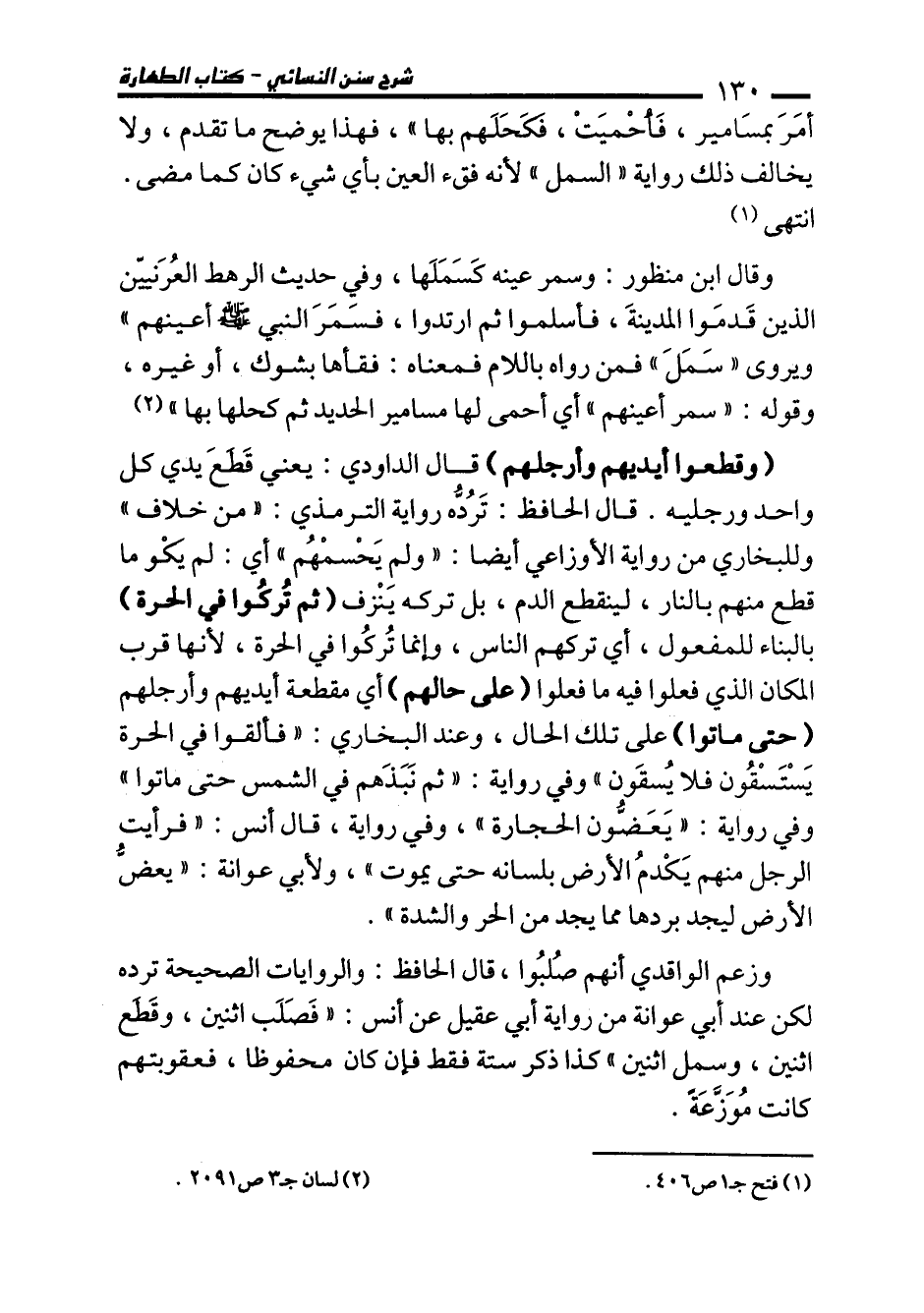 (وقطعوا أيديهم وأرجلهم) قال الداودي: يعني قَطَعَ يدي كل واحد ورجليه. قال الحافظ: تَرُدُّه رواية الترمذي: "من خلاف" وللبخاري من رواية الأوزاعي أيضا: "ولم يَحْسمْهُم" أي: لم يَكْو ما قطع منهم بالنار، لينقطع الدم، بل تركه يَنْزف (ثم تُركُوا في الحرة) بالبناء للمفعول، أي تركهم الناس، وإنما تُركُوا في الحرة, لأنها قرب المكان الذي فعلوا فيه ما فعلوا (على حالهم) أي مقطعة أيديهم وأرجلهم (حتى ماتوا) على تلك الحال، وعند البخاري: "فألقوا في الحرة يَسْتَسْقُون فلا يُسقَون" وفي رواية: "ثم نَبَذَهم في الشمس حتى ماتوا" وفي رواية: "يَعَضُّون الحجارة"، وفي رواية, قال أنس: "فرأيت الرجل منهم يَكْدمُ الأرض بلسانه حتى يموت"، ولأبي عوانة: "يعضُّ الأرض ليجد بردها مما يجد من الحر والشدة".