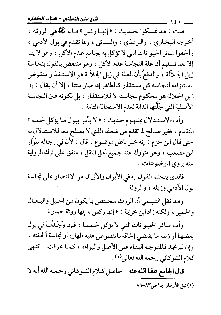 وأما سائر الحيوانات التي لا يؤكل لحمها، فإن وَجَدْتَ في بول بعضها أو زبله ما يقتضي إلحاقه بالمنصوص عليه طهارة أو نجاسة ألحقته، وإن لم تجد فالمتوجه البقاء على الأصل والبراءة، كما عرفت. انتهى كلام الشوكاني رحمه الله تعالى (¬1).