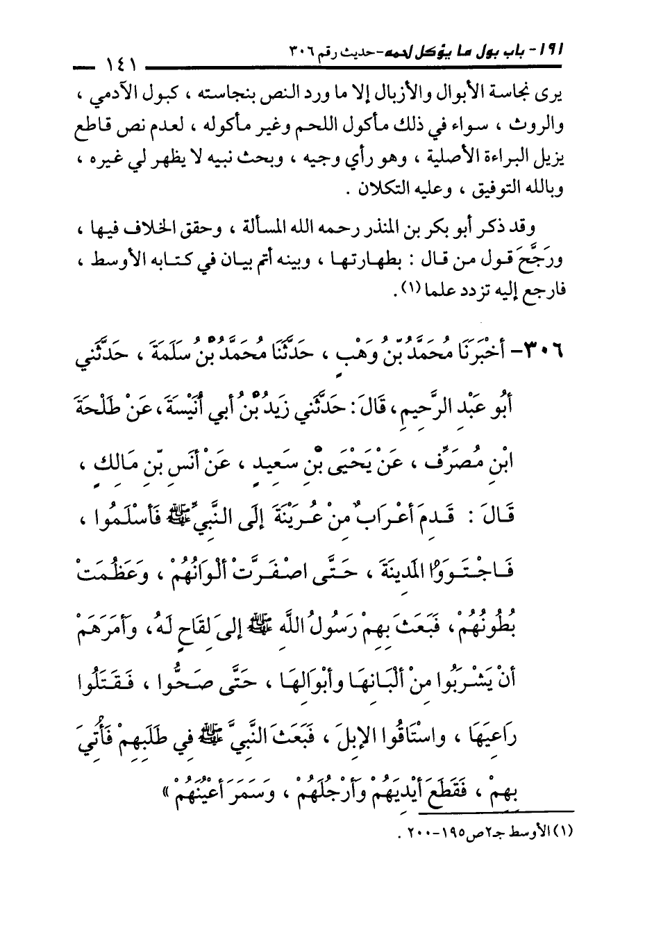 306 - أَخْبَرَنَا مُحَمَّدُ بْنُ وَهْبٍ، حَدَّثَنَا مُحَمَّدُ بْنُ سَلَمَةَ، عَنْ أَبِو عَبْدِ الرَّحِيمِ، قَالَ: حَدَّثَنِي زَيْدُ بْنُ أَبِي أُنَيْسَةَ، عَنْ طَلْحَةَ بْنِ مُصَرِّفٍ، عَنْ يَحْيَى بْنِ سَعِيدٍ، عَنْ أَنَسِ بْنِ مَالِكٍ، قَالَ: قَدِمَ أَعْرَابٌ مِنْ عُرَيْنَةَ إِلَى النَّبِيِّ - صلى الله عليه وسلم - فَأَسْلَمُوا، فَاجْتَوَوُا الْمَدِينَةَ، حَتَّى اصْفَرَّتْ أَلْوَانُهُمْ، وَعَظُمَتْ بُطُونُهُمْ، فَبَعَثَ بِهِمْ رَسُولُ اللهِ - صلى الله عليه وسلم - إِلَى لِقَاحٍ لَهُ، وَأَمَرَهُمْ أَنْ يَشْرَبُوا مِنْ أَلْبَانِهَا وَأَبْوَالِهَا، حَتَّى صَحُّوا، فَقَتَلُوا رَاعِيَهَا، وَاسْتَاقُوا الإِبِلَ، فَبَعَثَ النَّبِيَّ - صلى الله عليه وسلم - فِي طَلَبِهِمْ فَأُتِيَ بِهِمْ، فَقَطَعَ أَيْدِيَهُمْ وَأَرْجُلَهُمْ، وَسَمَرَ أَعْيُنَهُمْ"