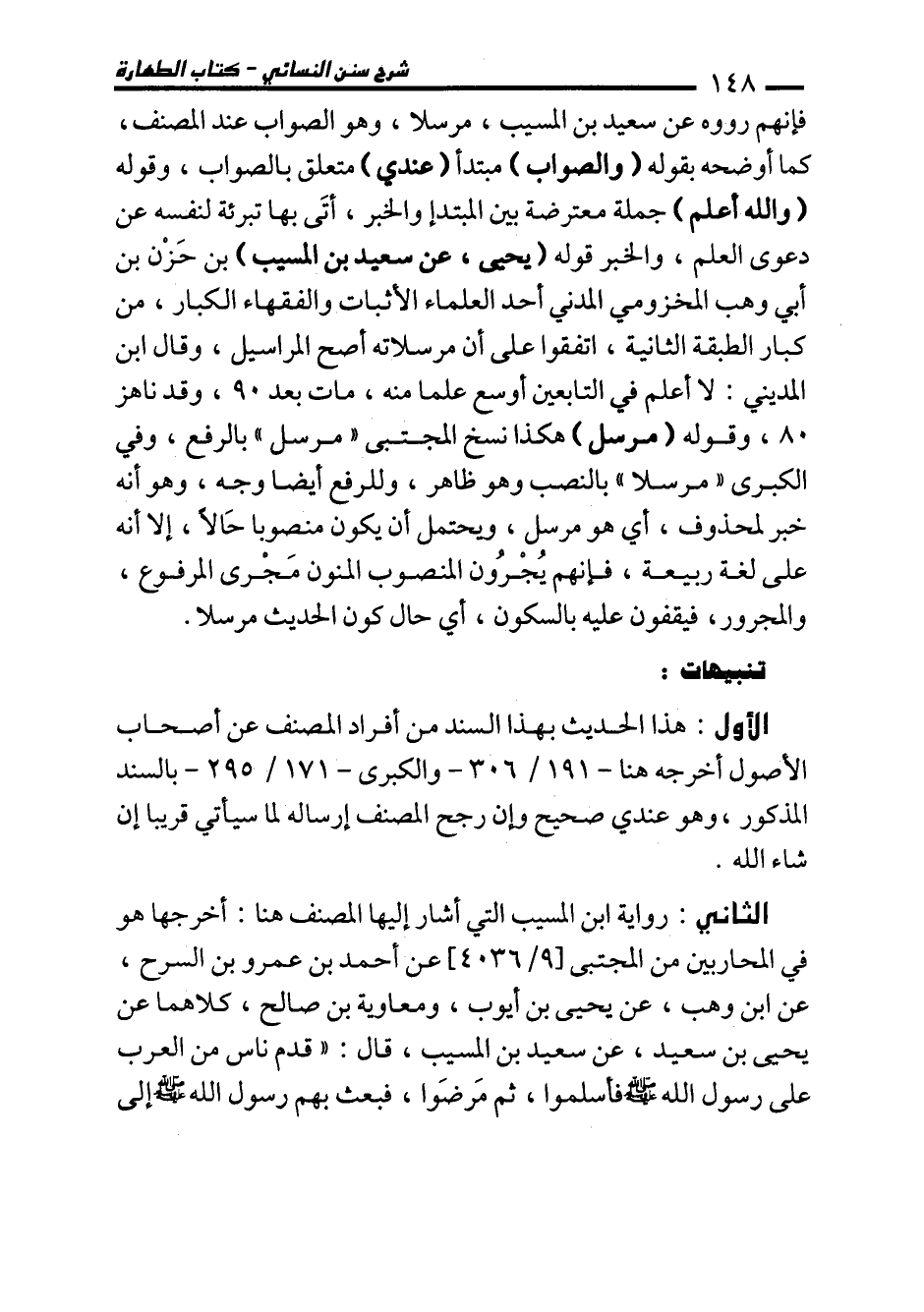 الأول: هذا الحديث بهذا السند من أفراد المصنف عن أصحاب الأصول أخرجه هنا -191/ 306 - والكبرى -171/ 295 - بالسند المذكور، وهو عندي صحيح وإن رجح المصنف إرساله لما سيأتي قريبا إن شاء الله.