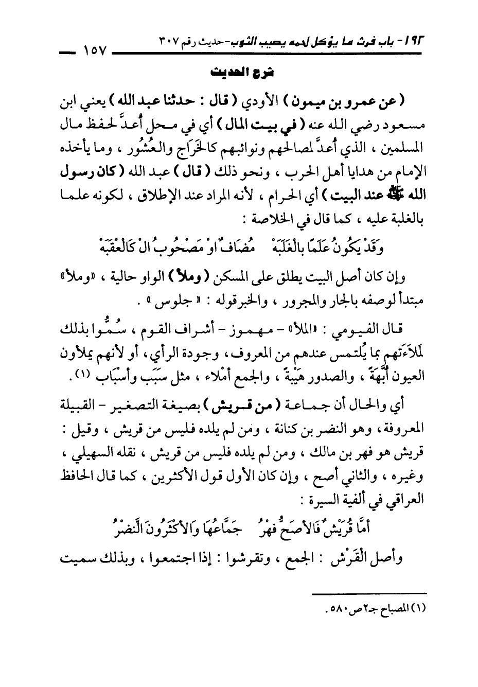 (عن عمرو بن ميمون) الأودي (قال: حدثنا عبد الله) يعني ابن مسعود رضي الله عنه (في بيت المال) أي في محل أُعدَّ لحفظ مال المسلمين، الذي أُعدَّ لمصالحهم ونوائبهم كالخَرَاج والعُشُور، وما يأخذه الإمام من هدايا أهل الحرب، ونحو ذلك (قال) عبد الله (كان رسول الله - صلى الله عليه وسلم - عند البيت) أي الحرام, لأنه المراد عند الإطلاق، لكونه علما بالغلبة عليه، كما قال في الخلاصة: