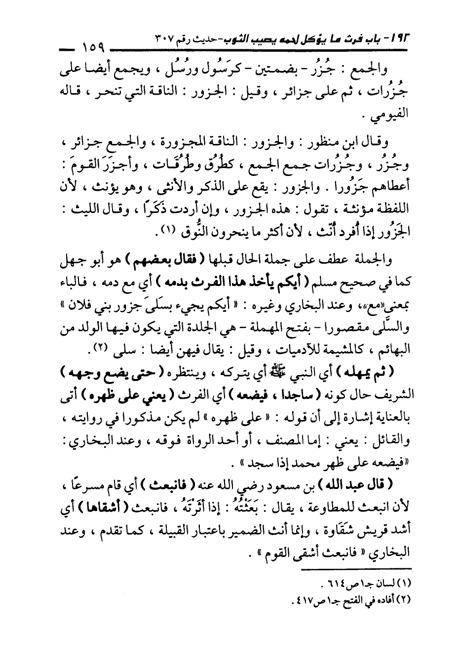 والجملة عطف على جملة الحال قبلها (فقال بعضهم) هو أبو جهل كما في صحيح مسلم (أيكم يأخذ هذا الفرث بدمه) أي مع دمه، فالباء بمعنى "مع"، وعند البخاري وغيره: "أيكم يجيء بسَلىَ جزور بني فلان" والسَّلى مقصورا -بفتح المهملة- هي الجلدة التي يكون فيها الولد من البهائم، كالمشيمة للآدميات، وقيل: يقال فيهن أيضا: سلى (¬2).