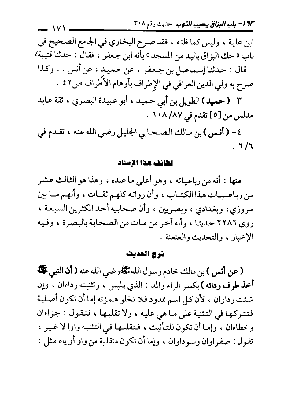 (عن أنس) بن مالك خادم رسول الله - صلى الله عليه وسلم - رضي الله عنه (أن النبي - صلى الله عليه وسلم - أخد طرف ردائه) بكسر الراء والمد: الذي يلبس، وتثنيته رداءان، وإن شئت رداوان؛ لأن كل اسم ممدود فلا تخلو همزته إما أن تكون أصلية فتتركها في التثنية على ما هي عليه، ولا تقلبها، فتقول: جزاءان وخطاءان، وإما أن تكون للتأنيث، فتقلبها في التثنية واوا لا غير، تقول: صفراوان وسوداوان، وإما أن تكون منقلبة من واو أو ياء مثل: