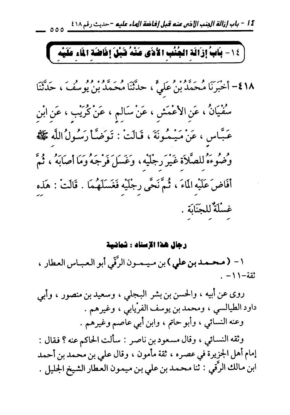 418 - أَخْبَرَنَا مُحَمَّدُ بْنُ عَلِيٍّ، حَدَّثَنَا مُحَمَّدُ بْنُ يُوسُفَ، حَدَّثَنَا سُفْيَانُ، عَنِ الأَعْمَشِ، عَنْ سَالِمٍ، عَنْ كُرَيْبٍ، عَنِ ابْنِ عَبَّاسٍ، عَنْ مَيْمُونَةَ، قَالَتْ: تَوَضَّأَ رَسُولُ اللهِ - صلى الله عليه وسلم - وُضُوءَهُ لِلصَّلاَةِ غَيْرَ رِجْلَيْهِ، وَغَسَلَ فَرْجَهُ وَمَا أَصَابَهُ، ثُمَّ أَفَاضَ عَلَيْهِ الْمَاءَ، ثُمَّ نَحَّى رِجْلَيْهِ فَغَسَلَهُمَا. قَالَتْ: هَذِهِ غِسْلَةٌ لِلْجَنَابَةِ.
