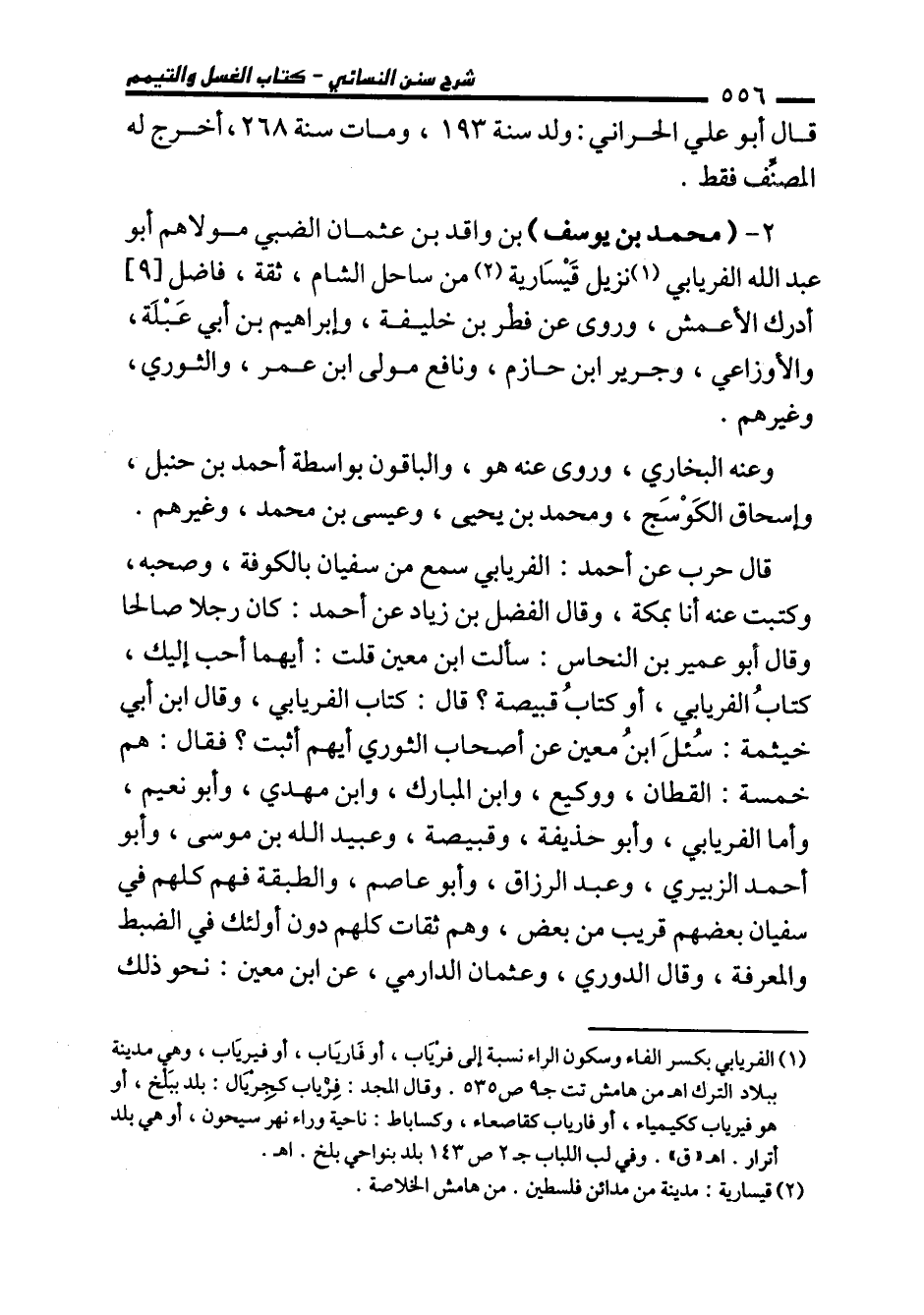 (¬1) الفريابي بكسر الفاء وسكون الراء نسبة إلى فرْيَاب، أو فَاريَاب، أو فيريَاب، وهي مدينة ببلاد الترك اهـ من هامش تت جـ 9 ص 535. وقال المجد: فِرْياب كجِرْيَال: بلد ببَلْخ، أو هو فيرياب ككيمياء، أو فارياب كقاصعاء، وكساباط: ناحية وراء نهر سيحون، أو هي بلد أترار. اهـ "ق". وفي لب اللباب جـ 2 ص 143 بلد بنواحي بلخ. اهـ.