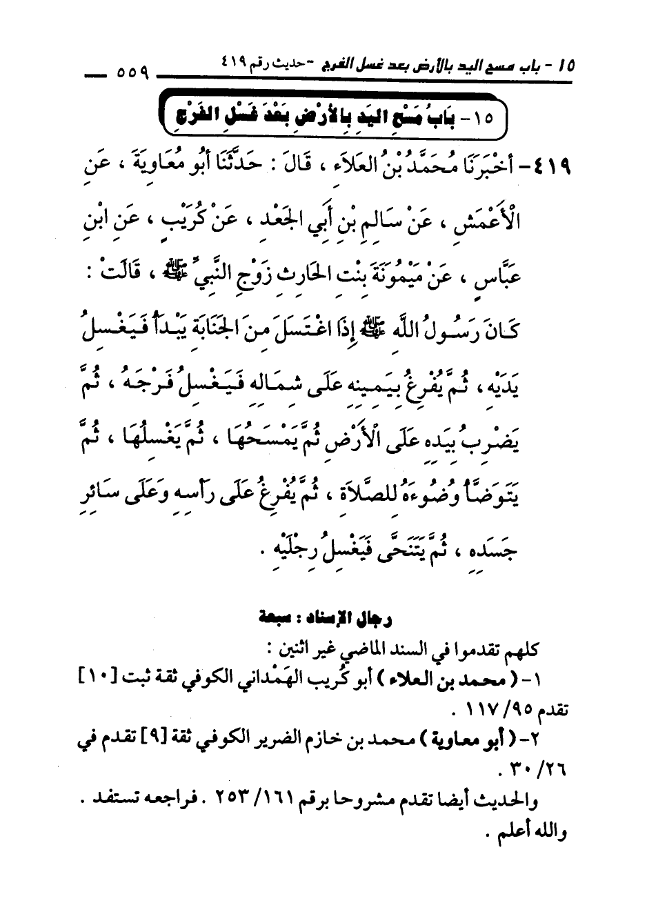 419 - أَخْبَرَنَا مُحَمَّدُ بْنُ الْعَلاَءِ، قَالَ: حَدَّثَنَا أَبُو مُعَاوِيَةَ، عَنِ الأَعْمَشِ، عَنْ سَالِمِ بْنِ أَبِي الْجَعْدِ، عَنْ كُرَيْبٍ، عَنِ ابْنِ عَبَّاسٍ، عَنْ مَيْمُونَةَ بِنْتِ الْحَارِثِ زَوْجِ النَّبِيِّ - صلى الله عليه وسلم -، قَالَتْ: كَانَ رَسُولُ اللهِ - صلى الله عليه وسلم - إِذَا اغْتَسَلَ مِنَ الْجَنَابَةِ يَبْدَأُ فَيَغْسِلُ يَدَيْهِ، ثُمَّ يُفْرِغُ بِيَمِينِهِ عَلَى شِمَالِهِ فَيَغْسِلُ فَرْجَهُ، ثُمَّ يَضْرِبُ بِيَدِهِ عَلَى الأَرْضِ ثُمَّ يَمْسَحُهَا، ثُمَّ يَغْسِلُهَا، ثُمَّ يَتَوَضَّأُ وُضُوءَهُ لِلصَّلاَةِ، ثُمَّ يُفْرِغُ عَلَى رَأْسِهِ وَعَلَى سَائِرِ جَسَدِهِ، ثُمَّ يَتَنَحَّى فَيَغْسِلُ رِجْلَيْهِ.