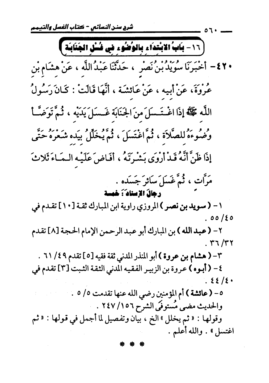 420 - أَخْبَرَنَا سُوَيْدُ بْنُ نَصْرٍ، حَدَّثَنَا عَبْدُ اللهِ، عَنْ هِشَامِ بْنِ عُرْوَةَ، عَنْ أَبِيهِ، عَنْ عَائِشَةَ، أَنَّهَا قَالَتْ: كَانَ رَسُولُ اللهِ - صلى الله عليه وسلم - إِذَا اغْتَسَلَ مِنَ الْجَنَابَةِ غَسَلَ يَدَيْهِ، ثُمَّ تَوَضَّأَ وُضُوءَهُ لِلصَّلاَةِ، ثُمَّ اغْتَسَلَ، ثُمَّ يُخَلِّلُ بِيَدِهِ شَعْرَهُ حَتَّى إِذَا ظَنَّ أَنَّهُ قَدْ أَرْوَى بَشَرَتَهُ، أَفَاضَ عَلَيْهِ الْمَاءَ ثَلاَثَ مَرَّاتٍ، ثُمَّ غَسَلَ سَائِرَ جَسَدِهِ.