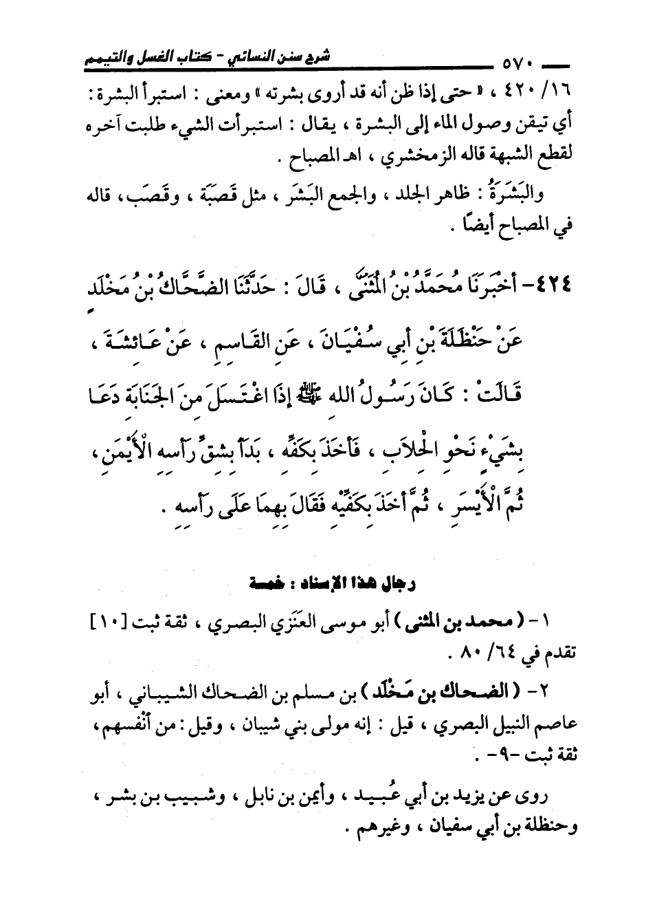 424 - أَخْبَرَنَا مُحَمَّدُ بْنُ الْمُثَنَّى، قَالَ: حَدَّثَنَا الضَّحَّاكُ بْنُ مَخْلَدٍ، عَنْ حَنْظَلَةَ بْنِ أَبِي سُفْيَانَ، عَنِ الْقَاسِمِ، عَنْ عَائِشَةَ، قَالَتْ: كَانَ رَسُولُ اللهِ - صلى الله عليه وسلم - إِذَا اغْتَسَلَ مِنَ الْجَنَابَةِ دَعَا بِشَيْءٍ نَحْوِ الْحِلاَبِ، فَأَخَذَ بِكَفِّهِ، بَدَأَ بِشِقِّ رَأْسِهِ الأَيْمَنِ، ثُمَّ الأَيْسَرِ، ثُمَّ أَخَذَ بِكَفَّيْهِ فَقَالَ بِهِمَا عَلَى رَأْسِهِ.
