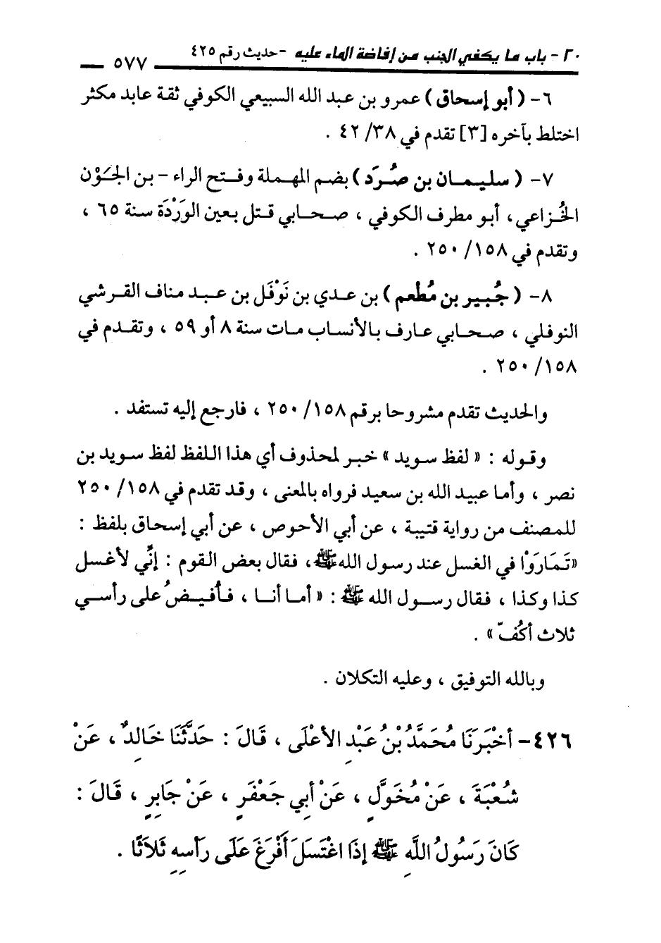 426 - أَخْبَرَنَا مُحَمَّدُ بْنُ عَبْدِ الأَعْلَى، قَالَ: حَدَّثَنَا خَالِدٌ، عَنْ شُعْبَةَ، عَنْ مُخَوَّلٍ، عَنْ أَبِي جَعْفَرٍ، عَنْ جَابِرٍ، قَالَ: كَانَ رَسُولُ اللهِ - صلى الله عليه وسلم - إِذَا اغْتَسَلَ أَفْرَغَ عَلَى رَأْسِهِ ثَلاَثًا.