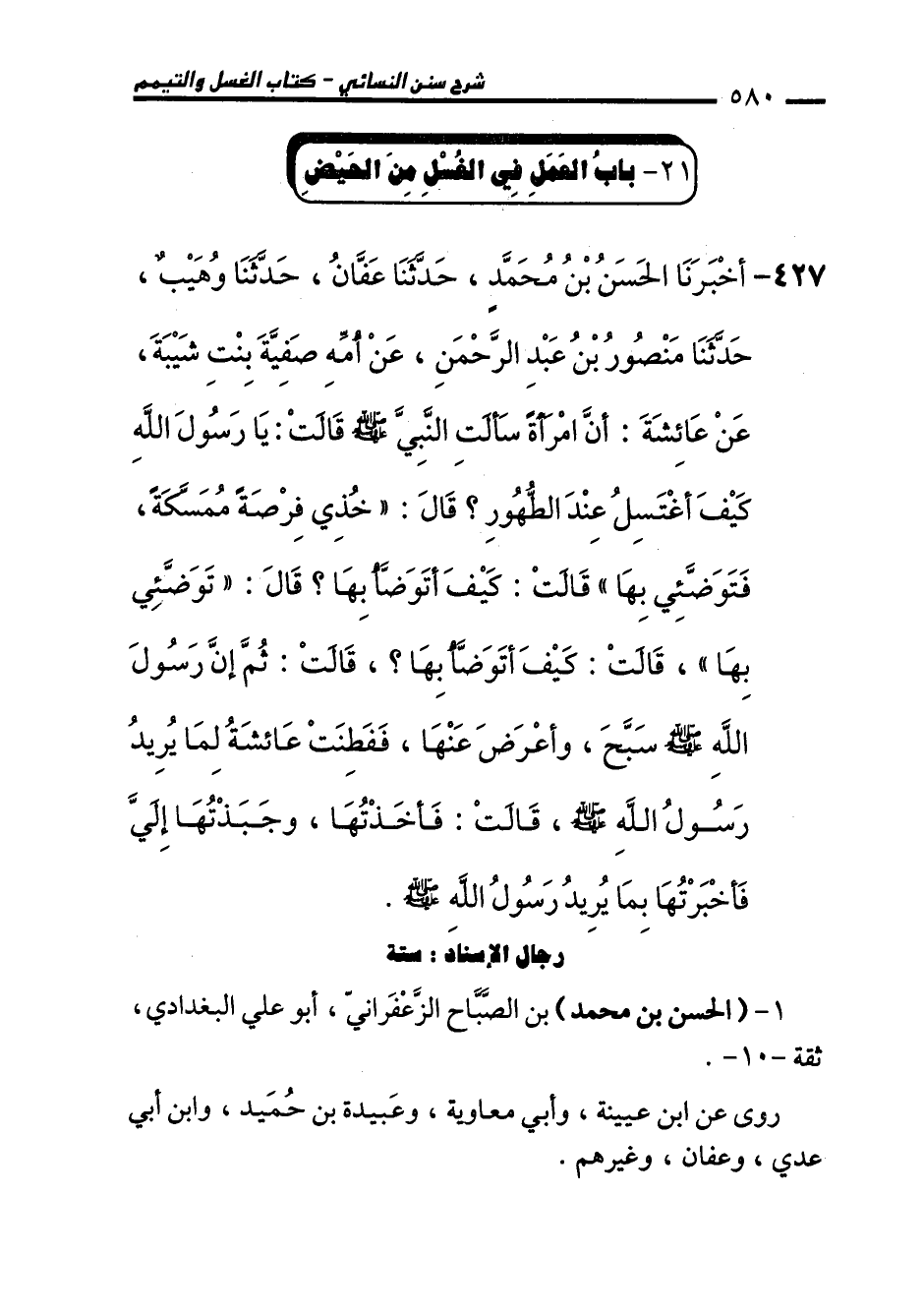 427 - أَخْبَرَنَا الْحَسَنُ بْنُ مُحَمَّدٍ، حَدَّثَنَا عَفَّانُ، حَدَّثَنَا وُهَيْبٌ، حَدَّثَنَا مَنْصُورُ بْنُ عَبْدِ الرَّحْمَنِ، عَنْ أُمِّهِ صَفِيَّةَ بِنْتِ شَيْبَةَ، عَنْ عَائِشَةَ: أَنَّ امْرَأَةً سَأَلَتِ النَّبِيَّ - صلى الله عليه وسلم - قَالَتْ: يَا رَسُولَ اللهِ كَيْفَ أَغْتَسِلُ عِنْدَ الطُّهُورِ؟ قَالَ: "خُذِي فِرْصَةً مُمَسَّكَةً، فَتَوَضَّئِي بِهَا". قَالَتْ: كَيْفَ أَتَوَضَّأُ بِهَا؟ قَالَ: "تَوَضَّئِي بِهَا". قَالَتْ: كَيْفَ أَتَوَضَّأُ بِهَا؟ قَالَتْ: ثُمَّ إِنَّ رَسُولَ اللهِ - صلى الله عليه وسلم - سَبَّحَ، وَأَعْرَضَ عَنْهَا، فَفَطِنَتْ عَائِشَةُ لِمَا يُرِيدُ رَسُولُ اللهِ - صلى الله عليه وسلم -، قَالَتْ: فَأَخَذْتُهَا، وَجَبَذْتُهَا إِلَيَّ فَأَخْبَرْتُهَا بِمَا يُرِيدُ رَسُولُ اللهِ - صلى الله عليه وسلم -.