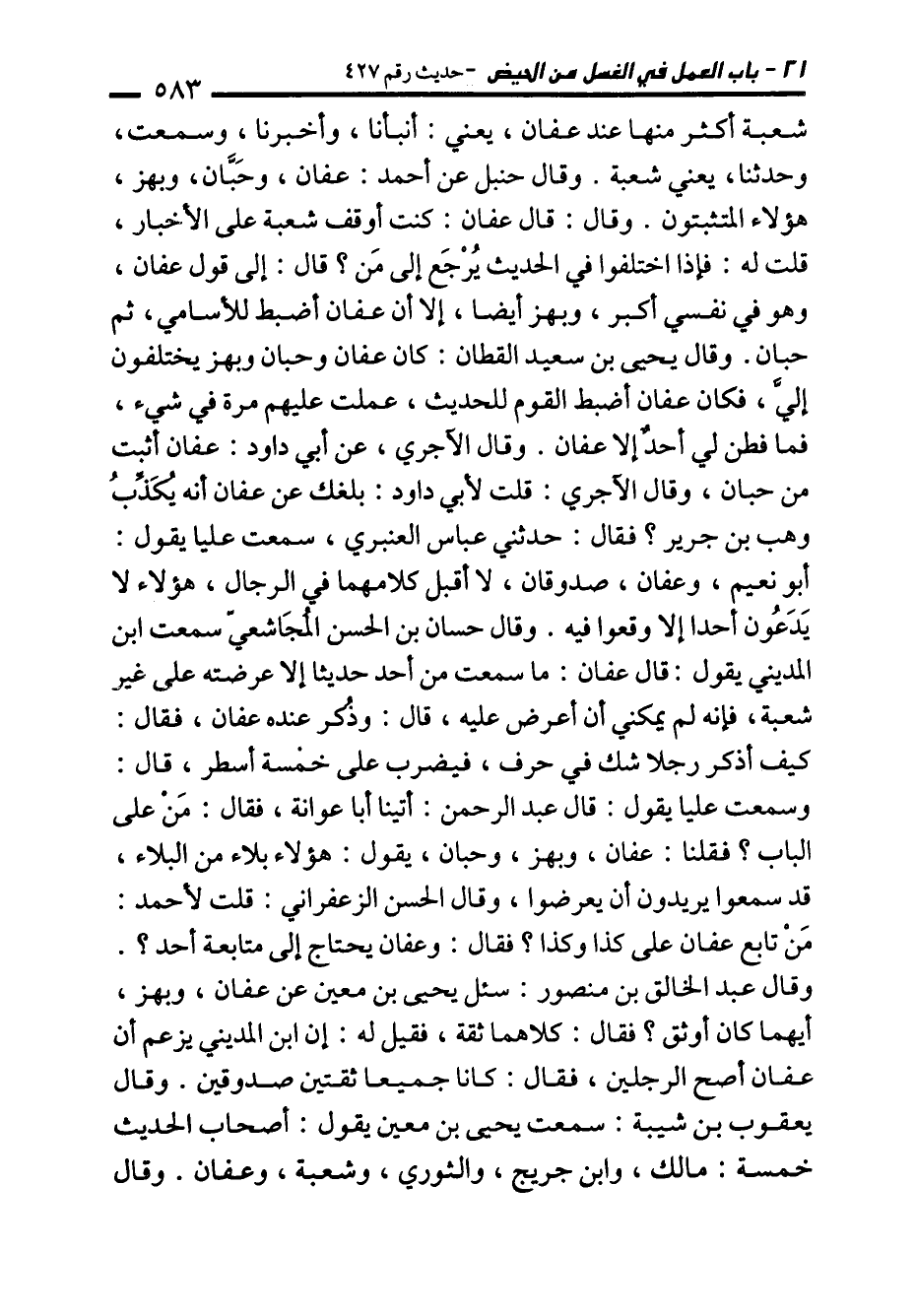 شعبة أكثر منها عند عفان، يعني: أنبأنا، وأخبرنا، وسمعت، وحدثنا، يعني شعبة. وقال حنبل عن أحمد: عفان، وحَبَّان، وبهز، هؤلاء المتثبتون. وقال: قال عفان: كنت أوقف شعبة على الأخبار، قلت له: فإذا اختلفوا في الحديث يُرْجَع إلى مَن؟ قال: إلى قول عفان، وهو في نفسي أكبر، وبهز أيضا، إلا أن عفان أضبط للأسامي، ثم حبان. وقال يحيى بن سعيد القطان: كان عفان وحبان وبهز يختلفون إليَّ، فكان عفان أضبط القوم للحديث، عملت عليهم مرة في شيء، فما فطن لي أحدٌ إلا عفان. وقال الآجري، عن أبي داود: عفان أثبت من حبان، وقال الآجري: قلت لأبي داود: بلغك عن عفان أنه يُكَذِّبُ وهب بن جرير؟ فقال: حدثني عباس العنبري، سمعت عليا يقول: أبو نعيم، وعفان، صدوقان، لا أقبل كلامهما في الرجال، هؤلاء لا يَدَعُون أحدا إلا وقعوا فيه. وقال حسان بن الحسن المُجَاشعيّ سمعت ابن المديني يقول: قال عفان: ما سمعت من أحد حديثًا إلا عرضته على غير شعبة، فإنه لم يمكني أن أعرض عليه، قال: وذُكر عنده عفان، فقال: كيف أذكر رجلا شك في حرف، فيضرب على خمسة أسطر، قال: