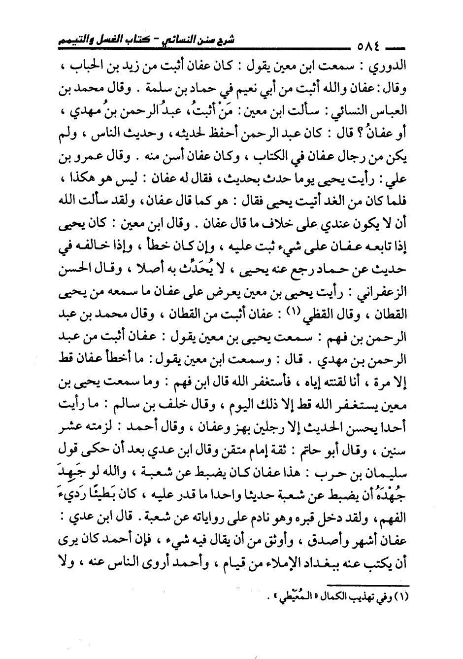 الدوري: سمعت ابن معين يقول: كان عفان أثبت من زيد بن الحباب، وقال: عفان والله أثبت من أبي نعيم في حماد بن سلمة. وقال محمَّد بن العباس النسائي: سألت ابن معين: مَنْ أثبتُ، عبدُ الرحمن بنُ مهدي، أو عفانُ؟ قال: كان عبد الرحمن أحفظ لحديثه، وحديث الناس، ولم يكن من رجال عفان في الكتاب، وكان عفان أسن منه. وقال عمرو بن علي: رأيت يحيى يوما حدث بحديث، فقال له عفان: ليس هو هكذا، فلما كان من الغد أتيت يحيى فقال: هو كما قال عفان، ولقد سألت الله أن لا يكون عندي على خلاف ما قال عفان. وقال ابن معين: كان يحيى إذا تابعه عفان على شيء ثبت عليه، وإن كان خطأ، وإذا خالفه في حديث عن حماد رجع عنه يحيى، لا يُحَدِّث به أصلا، وقال الحسن الزعفراني: رأيت يحيى بن معين يعرض على عفان ما سمعه من يحيى القطان، وقال القظي (¬1): عفان أثبت من القطان، وقال محمَّد بن عبد الرحمن بن فهم: سمعت يحيى بن معين يقول: عفان أثبت من عبد الرحمن بن مهدي. قال: وسمعت ابن معين يقول: ما أخطأ عفان قط إلا مرة، أنا لقنته إياه، فأستغفر الله قال ابن فهم: وما سمعت يحيى بن معين يستغفر الله قط إلا ذلك اليوم، وقال خلف بن سالم: ما رأيت أحدا يحسن الحديث إلا رجلين بهز وعفان، وقال أحمد: لزمته عشر سنين، وقال أبو حاتم: ثقة إمام متقن وقال ابن عدي بعد أن حكى قول سليمان بن حرب: هذا عفان كان يضبط عن شعبة، والله لو جَهِدَ جُهْدَهُ أن يضبط عن شعبة حديثا واحدا ما قدر عليه، كان بَطيئًا رَديءَ الفهم، ولقد دخل قبره وهو نادم على رواياته عن شعبة. قال ابن عدي: عفان أشهر وأصدق، وأوثق من أن يقال فيه شيء، فإن أحمد كان يرى أن يكتب عنه ببغداد الإملاء من قيام، وأحمد أروى الناس عنه، ولا