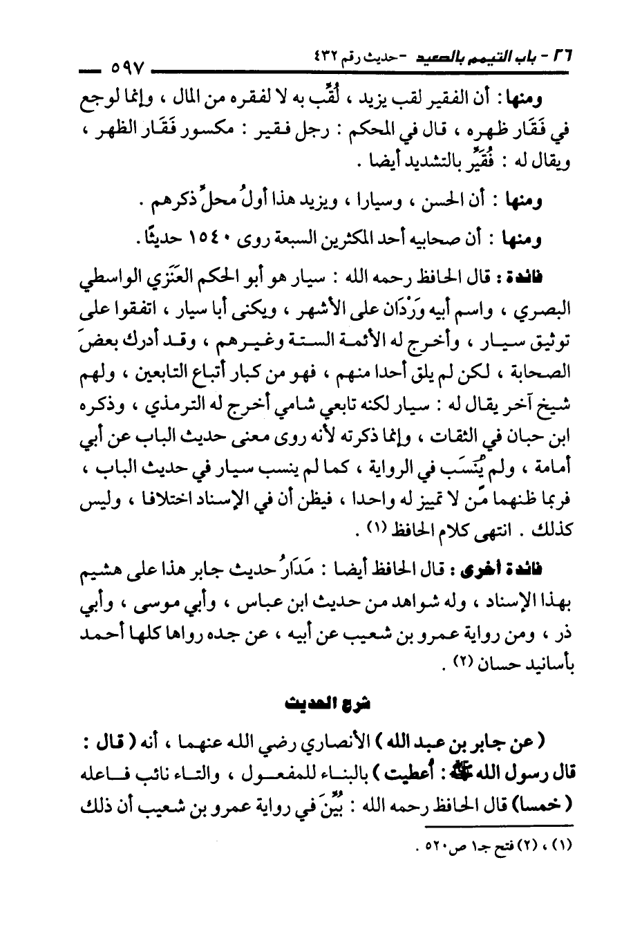 فائدة: قال الحافظ رحمه الله: سيار هو أبو الحكم العَنَزي الواسطي البصري، واسم أبيه وَرْدَان على الأشهر، ويكنى أبا سيار، اتفقوا على توثيق سيار، وأخرج له الأئمة الستة وغيرهم، وقد أدرك بعضَ الصحابة، لكن لم يلق أحدا منهم، فهو من كبار أتباع التابعين، ولهم شيخ آخر يقال له: سيار لكنه تابعي شامي أخرج له الترمذي، وذكره ابن حبان في الثقات، وإنما ذكرته لأنه روى معنى حديث الباب عن أبي أمامة، ولمْ يُنسَب في الرواية, كما لم ينسب سيار في حديث الباب، فربما ظنهما مَن لا تمييز له واحدا، فيظن أن في الإسناد اختلافا, وليس كذلك. انتهى كلام الحافظ (¬1).