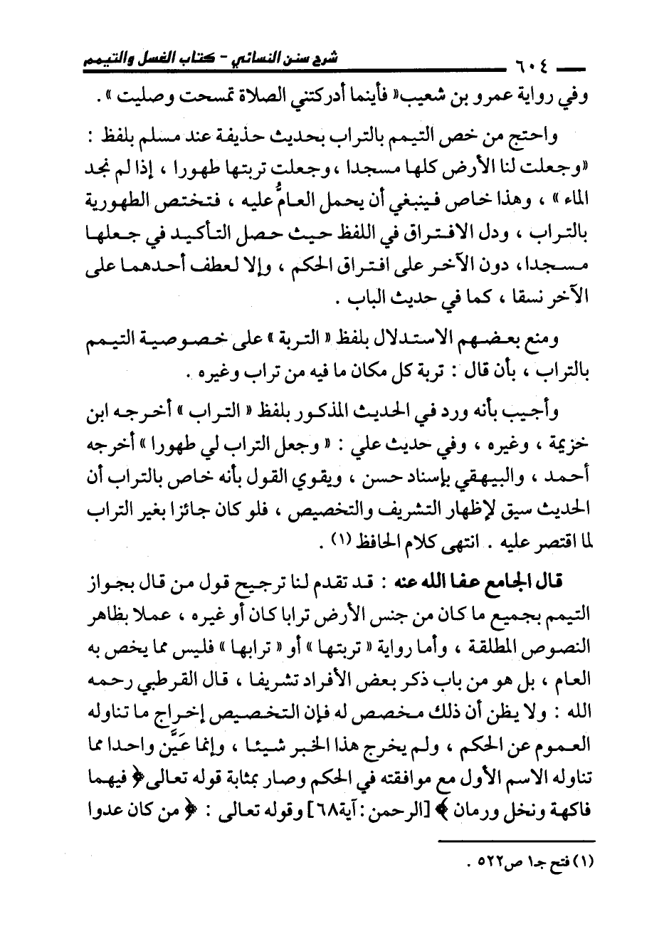 قال الجامع عفا الله عنه: قد تقدم لنا ترجيح قول من قال بجواز التيمم بجميع ما كان من جنس الأرض ترابا كان أو غيره، عملا بظاهر النصوص المطلقة، وأما رواية "تربتها" أو "ترابها" فليس مما يخص به العام، بل هو من باب ذكر بعض الأفراد تشريفا، قال القرطبي رحمه الله: ولا يظن أن ذلك مخصص له فإن التخصيص إخراج ما تناوله العموم عن الحكم، ولم يخرج هذا الخبر شيئا، وإنما عَيَّن واحدا مما تناوله الاسم الأول مع موافقته في الحكم وصار بمثابة قوله تعالى {فِيهِمَا فَاكِهَةٌ وَنَخْلٌ وَرُمَّانٌ} [الرحمن: آية 68] وقوله تعالى: {مَنْ كَانَ عَدُوًّا