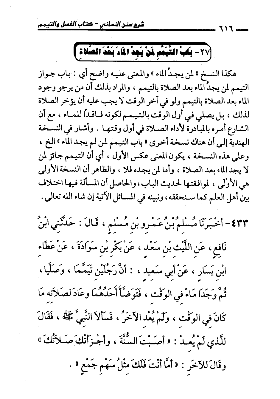 433 - أَخْبَرَنَا مُسْلِمُ بْنُ عَمْرِو بْنِ مُسْلِمٍ، قَالَ: حَدَّثَنِي ابْنُ نَافِعٍ، عَنِ اللَّيْثِ بْنِ سَعْدٍ، عَنْ بَكْرِ بْنِ سَوَادَةَ، عَنْ عَطَاءِ بْنِ يَسَارٍ، عَنْ أَبِي سَعِيدٍ،: أَنَّ رَجُلَيْنِ تَيَمَّمَا، وَصَلَّيَا، ثُمَّ وَجَدَا مَاءً فِي الْوَقْتِ، فَتَوَضَّأَ أَحَدُهُمَا وَعَادَ لِصَلاَتِهِ مَا كَانَ فِي الْوَقْتِ، وَلَمْ يُعِدِ الآخَرُ، فَسَأَلَا النَّبِيَّ - صلى الله عليه وسلم -، فَقَالَ لِلَّذِي لَمْ يُعِدْ: "أَصَبْتَ السُّنَّةَ، وَأَجْزَأَتْكَ صَلاَتُكَ". وَقَالَ لِلآخَرِ: "أَمَّا أَنْتَ فَلَكَ مِثْلُ سَهْمِ جَمْعٍ".