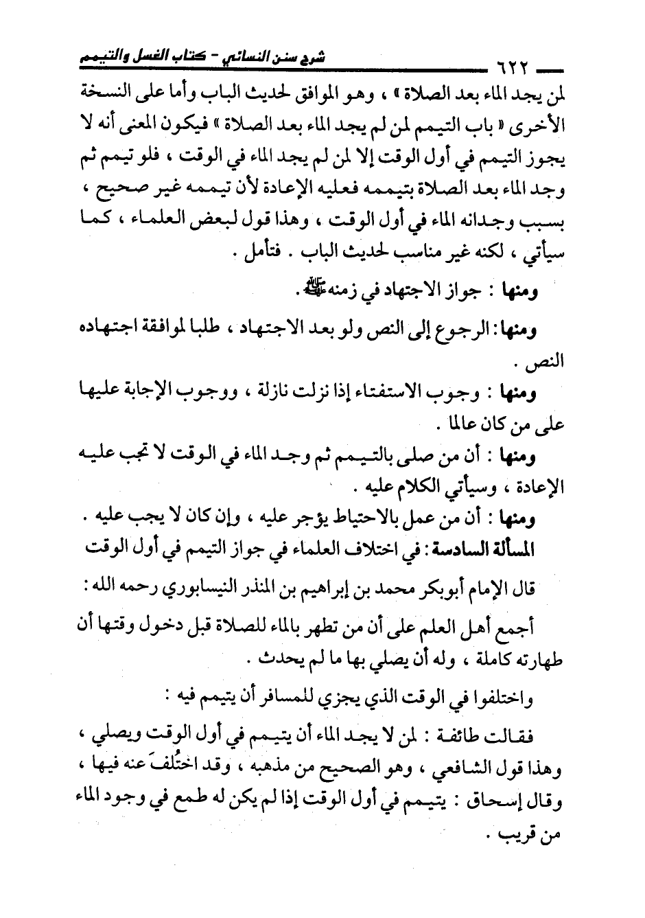 المسألة السادسة: في اختلاف العلماء في جواز التيمم في أول الوقت قال الإمام أبو بكر محمَّد بن إبراهيم بن المنذر النيسابوري رحمه الله: أجمع أهل العلم على أن من تطهير بالماء للصلاة قبل دخول وقتها أن طهارته كاملة، وله أن يصلي بها ما لم يحدث.