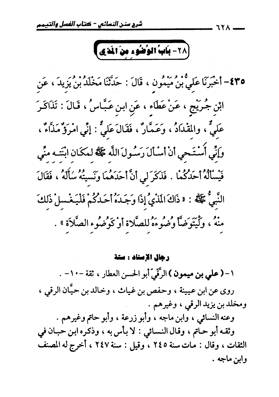 435 - أَخْبَرَنَا عَلِيُّ بْنُ مَيْمُونٍ، قَالَ: حَدَّثَنَا مَخْلَدُ بْنُ يَزِيدَ، عَنِ ابْنِ جُرَيْجٍ، عَنْ عَطَاءٍ، عَنِ ابْنِ عَبَّاسُ، قَالَ: تَذَاكَرَ عَلِيٌّ، وَالْمِقْدَادُ، وَعَمَّارٌ، فَقَالَ عَلِيٌّ: إِنِّي امْرَؤٌ مَذَّاءٌ، وَإِنِّي أَسْتَحِي أَنْ أَسْأَلَ رَسُولَ اللهِ - صلى الله عليه وسلم - لِمَكَانِ ابْنَتِهِ مِنِّي فَيَسْأَلُهُ أَحَدُكُمَا. فَذَكَرَ لِي أَنَّ أَحَدَهُمَا وَنَسِيتُهُ سَأَلَهُ، فَقَالَ النَّبِيُّ - صلى الله عليه وسلم -: "ذَاكَ الْمَذْيُ إِذَا وَجَدَهُ أَحَدُكُمْ فَلْيَغْسِلْ ذَلِكَ مِنْهُ، وَلْيَتَوَضَّأْ وُضُوءَهُ لِلصَّلاَةِ أَوْ كَوُضُوءِ الصَّلاَةِ".