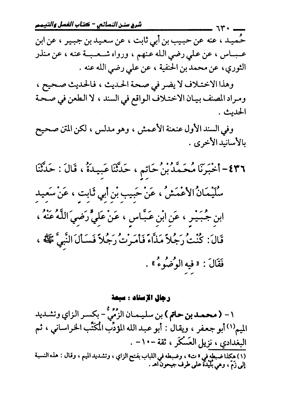 436 - أَخْبَرَنَا مُحَمَّدُ بْنُ حَاتِمٍ، حَدَّثَنَا عَبِيدَةُ، قَالَ: حَدَّثَنَا سُلَيْمَانُ الأَعْمَشُ، عَنْ حَبِيبِ بْنِ أَبِي ثَابِتٍ، عَنْ سَعِيدِ بْنِ جُبَيْرٍ، عَنِ ابْنِ عَبَّاسٍ، عَنْ عَلِيٍّ رَضِيَ اللهُ عَنْهُ، قَالَ: كُنْتُ رَجُلاً مَذَّاءً فَأَمَرْتُ رَجُلاً فَسَأَلَ النَّبِيَّ - صلى الله عليه وسلم - فَقَالَ: "فِيهِ الْوُضُوءُ".