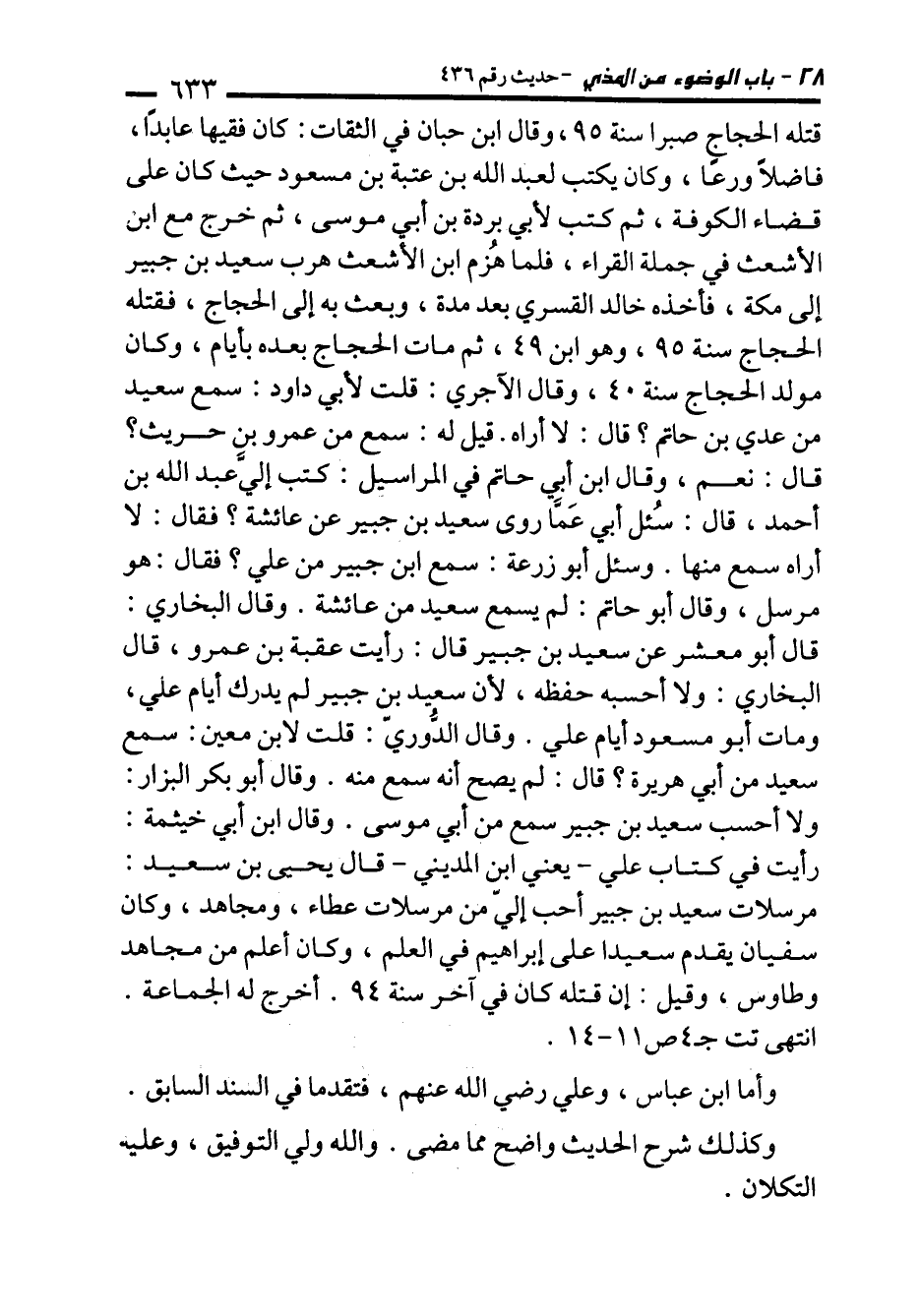 مرسلات سعيد بن جبير أحب إليّ من مرسلات عطاء، ومجاهد، وكان سفيان يقدم سعيدا على إبراهيم في العلم، وكان أعلم من مجاهد وطاوس، وقيل: إن قتله كان في آخر سنة 94. أخرج له الجماعة. انتهى تت جـ 4 ص 11 - 14.