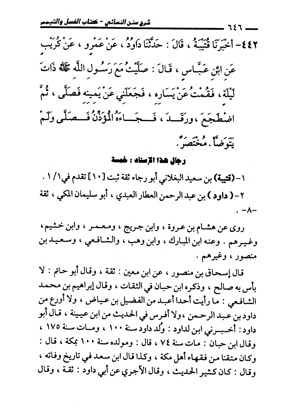 442 - أَخْبَرَنَا قُتَيْبَةُ، قَالَ: حَدَّثَنَا دَاوُدُ، عَنْ عَمْرٍو، عَنْ كُرَيْبٍ عَنِ ابْنِ عَبَّاسٍ، قَالَ: صَلَّيْتُ مَعَ النَّبِيِّ - صلى الله عليه وسلم - ذَاتَ لَيْلَةٍ، فَقُمْتُ عَنْ يَسَارِهِ، فَجَعَلَنِي عَنْ يَمِينِهِ فَصَلَّى، ثُمَّ اضْطَجَعَ، وَرَقَدَ، فَجَاءَهُ الْمُؤَذِّنُ فَصَلَّى وَلَمْ يَتَوَضَّأْ. مُخْتَصَرٌ.