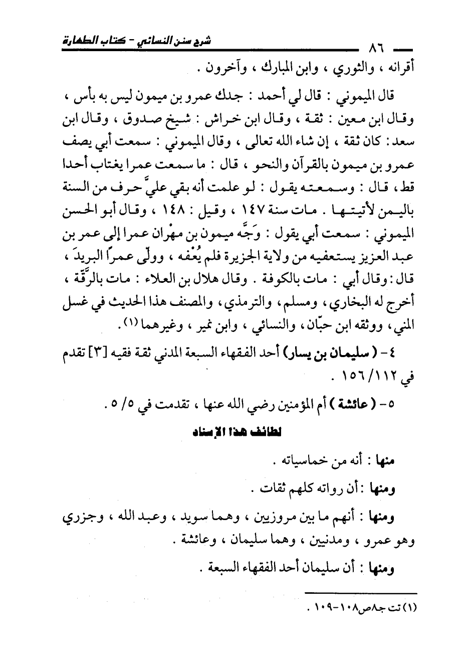 قال الميموني: قال لي أحمد: جدك عمرو بن ميمون ليس به بأس، وقال ابن معين: ثقة، وقال ابن خراش: شيخ صدوق، وقال ابن سعد: كان ثقة، إن شاء الله تعالى، وقال الميموني: سمعت أبي يصف عمرو بن ميمون بالقرآن والنحو، قال: ما سمعت عمرا يغتاب أحدا قط، قال: وسمعته يقول: لو علمت أنه بقي عليَّ حرف من السنة باليمن لأتيتها. مات سنة 147، وقيل: 148، وقال أبو الحسن الميموني: سمعت أبي يقول: وَجَّه ميمون بن مهْران عمرا إلى عمر بن عبد العزيز يستعفيه من ولاية الجزيرة فلم يُعْفه، وولّى عمرًا البريدَ، قال: وقال أبي: مات بالكوفة. وقال هلال بن العلاء: مات بالرَّقّة، أخرج له البخاري، ومسلم، والترمذي، والمصنف هذا الحديث في غسل المني، ووثقه ابن حبان، والنسائي، وابن نمير، وغيرهما (¬1).