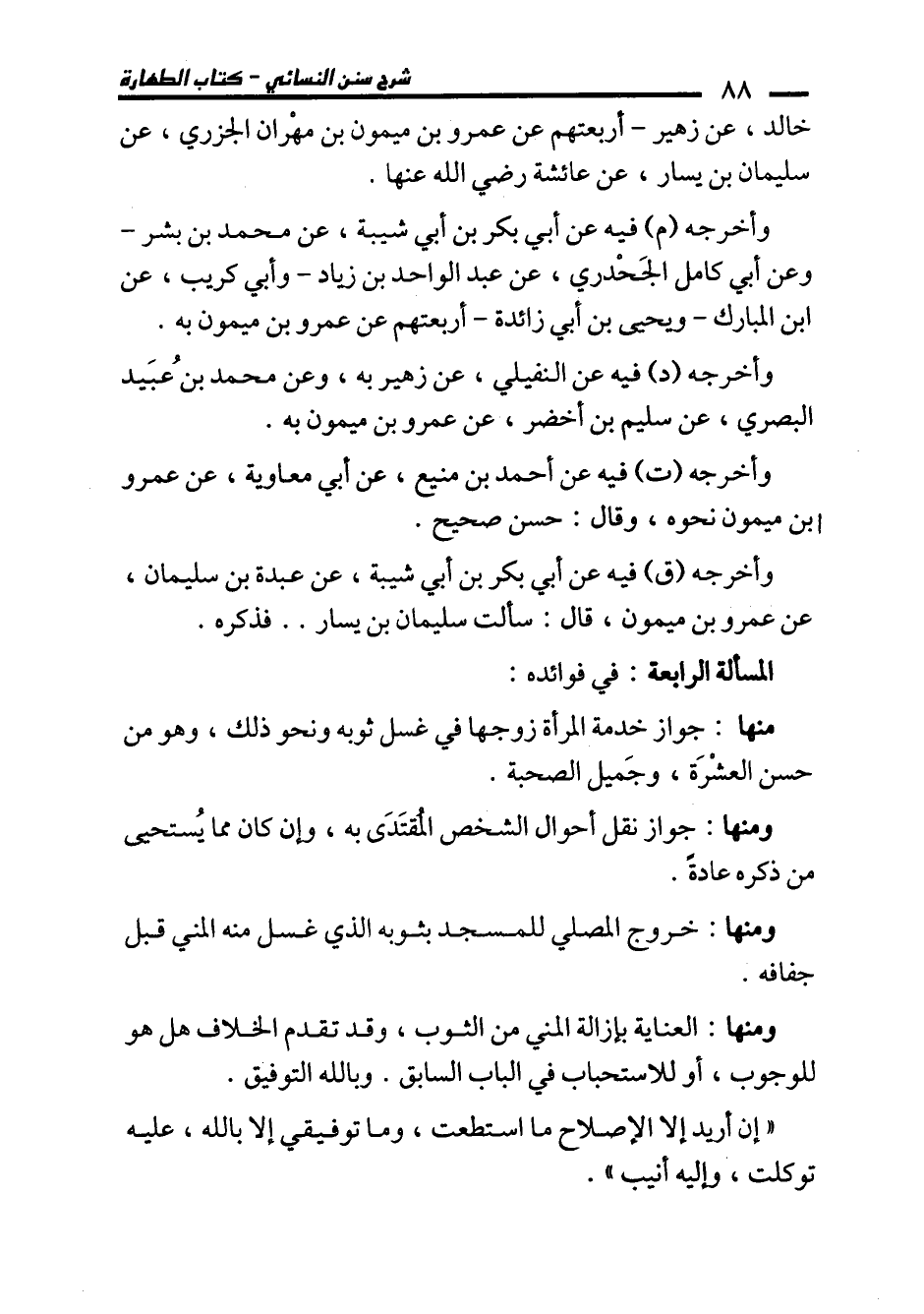 ومنها: العناية بإزالة المني من الثوب، وقد تقدم الخلاف هل هو للوجوب، أو للاستحباب في الباب السابق. وبالله التوفيق.