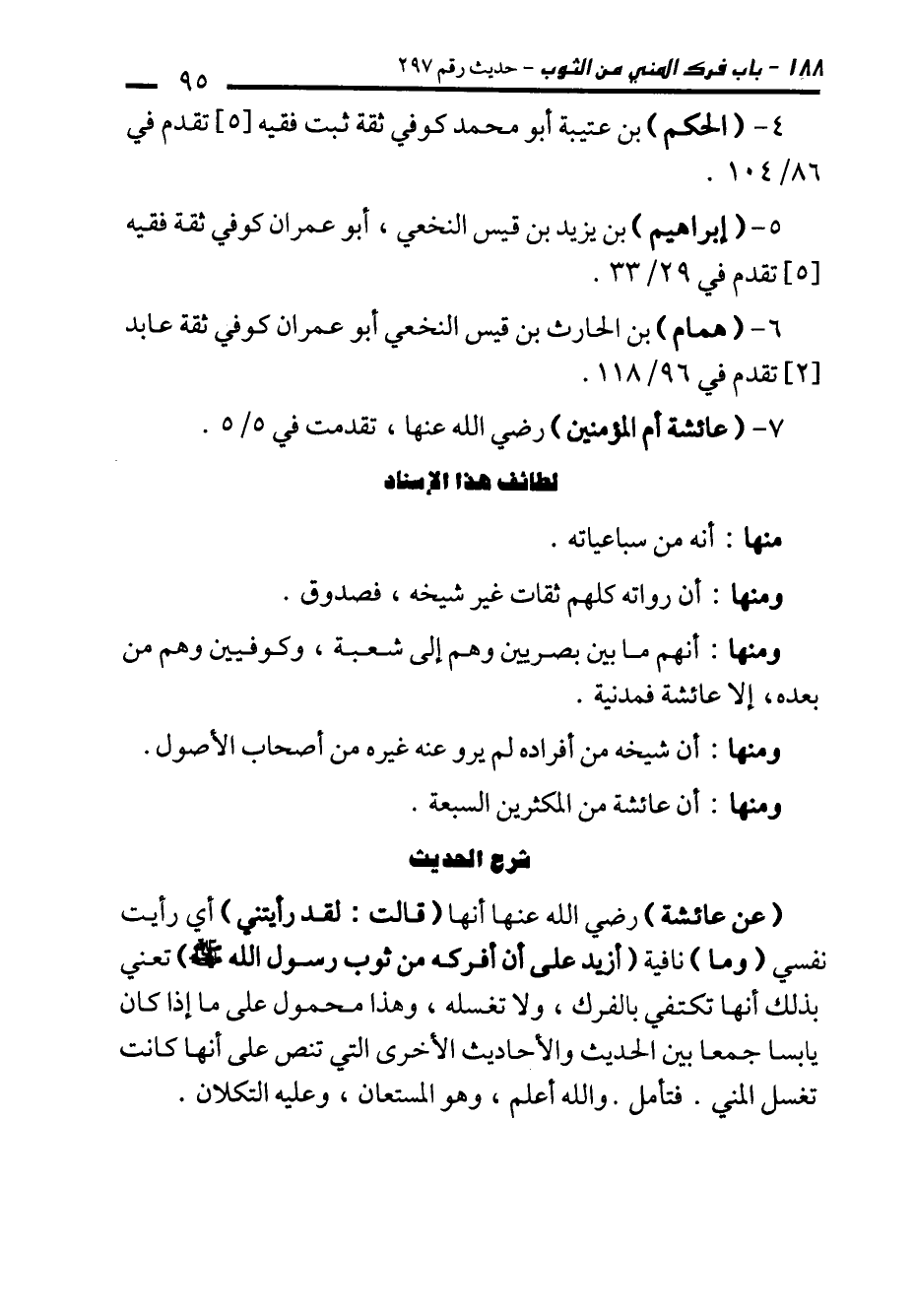(عن عائشة) رضي الله عنها أنها (قالت: لقد رأيتني) أي رأيت نفسي (وما) نافية (أزيد على أن أفركه من ثوب رسول الله - صلى الله عليه وسلم -) تعني بذلك أنها تكتفي بالفرك، ولا تغسله، وهذا محمول على ما إذا كان يابسا جمعا بين الحديث والأحاديث الأخرى التي تنص على أنها كانت تغسل المني. فتأمل. والله أعلم، وهو المستعان، وعليه التكلان.