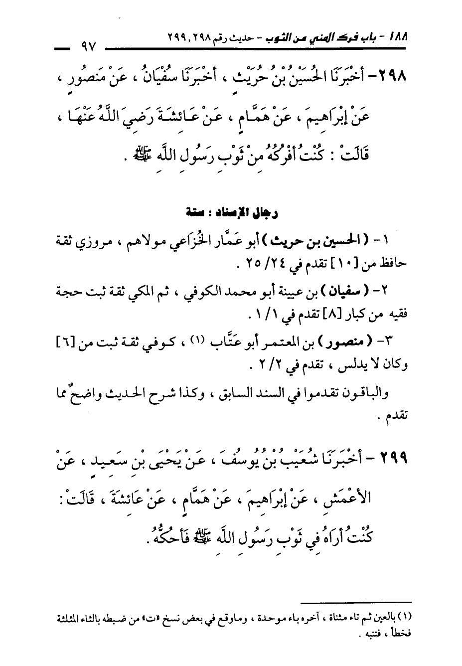 298 - أَخْبَرَنَا الْحُسَيْنُ بْنُ حُرَيْثٍ، أَخْبَرَنَا سُفْيَانُ، عَنْ مَنْصُورٍ، عَنْ إِبْرَاهِيمَ، عَنْ هَمَّامٍ، عَنْ عَائِشَةَ رَضِيَ اللهُ عَنْهَا، قَالَتْ: كُنْتُ أَفْرُكُهُ مِنْ ثَوْبِ النَّبِيِّ - صلى الله عليه وسلم -.