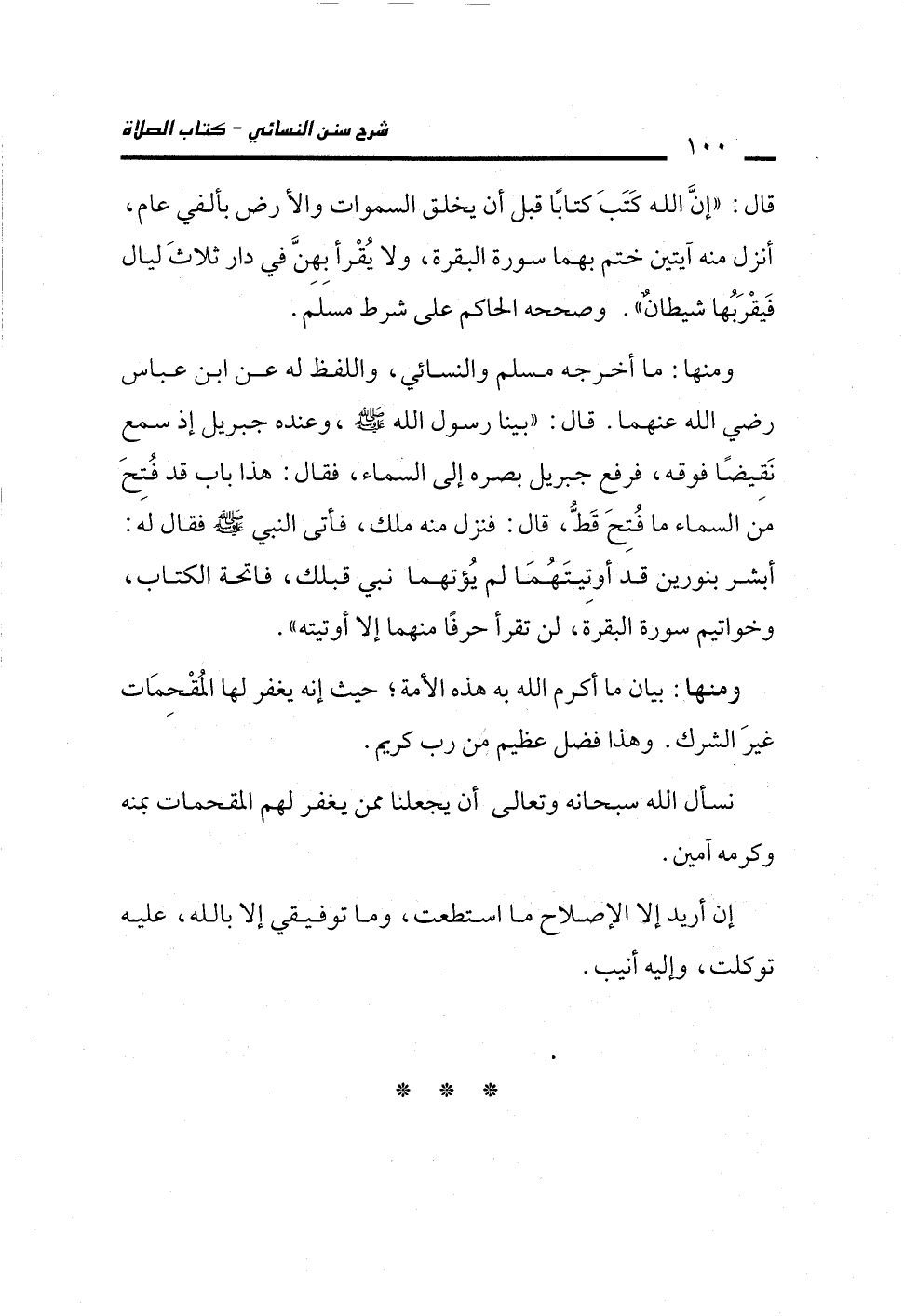 قال: "إنَّ الله كَتَبَ كتابًا قبل أن يخلق السموات والأرض بألفي عام، أنزل منه آيتين ختم بهما سورة البقرة، ولا يُقْرأ بهِنَّ في دار ثلاثَ ليال فَيقْرَبُها شيطانٌ". وصححه الحاكم على شرط مسلم.