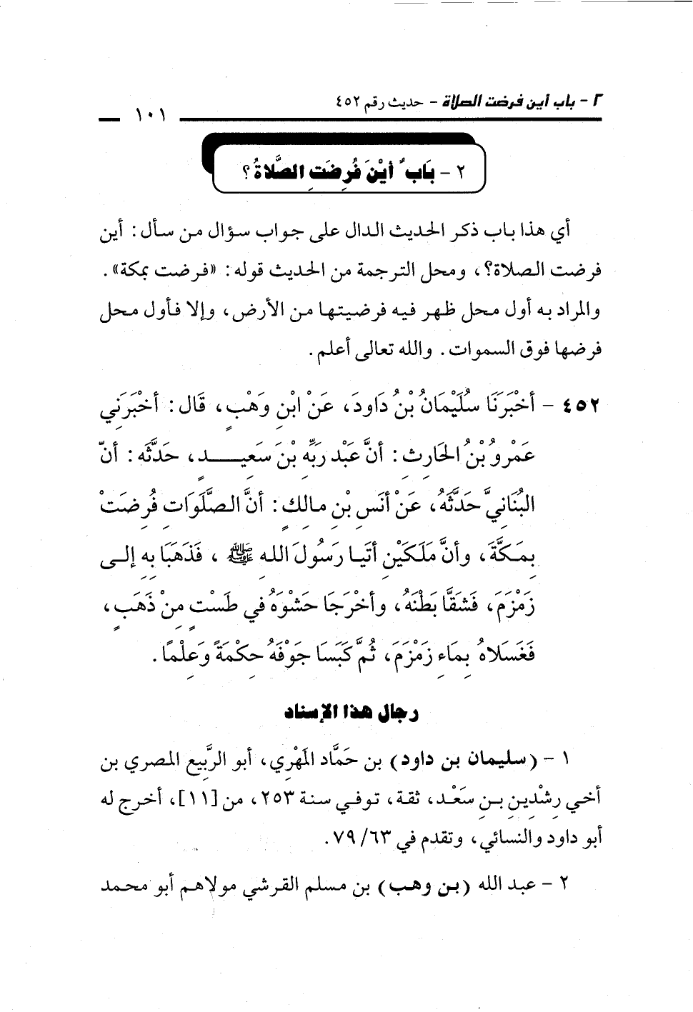 452 - أَخْبَرَنَا سُلَيْمَانُ بْنُ دَاوُدَ، عَنِ ابْنِ وَهْبٍ، قَالَ: أَخْبَرَنِي عَمْرُو بْنُ الْحَارِثِ: أَنَّ عَبْدَ رَبِّهِ بْنَ سَعِيدٍ، حَدَّثَهُ: أَنَّ الْبُنَانِيَّ حَدَّثَهُ، عَنْ أَنَسِ بْنِ مَالِكٍ: أَنَّ الصَّلَوَاتِ فُرِضَتْ بِمَكَّةَ، وَأَنَّ مَلَكَيْنِ أَتَيَا رَسُولَ اللهِ - صلى الله عليه وسلم -، فَذَهَبَا بِهِ إِلَى زَمْزَمَ، فَشَقَّا بَطْنَهُ، وَأَخْرَجَا حَشْوَهُ فِي طَسْتٍ مِنْ ذَهَبٍ، فَغَسَلاَهُ بِمَاءِ زَمْزَمَ، ثُمَّ كَبَسَا جَوْفَهُ حِكْمَةً وَعِلْمًا.