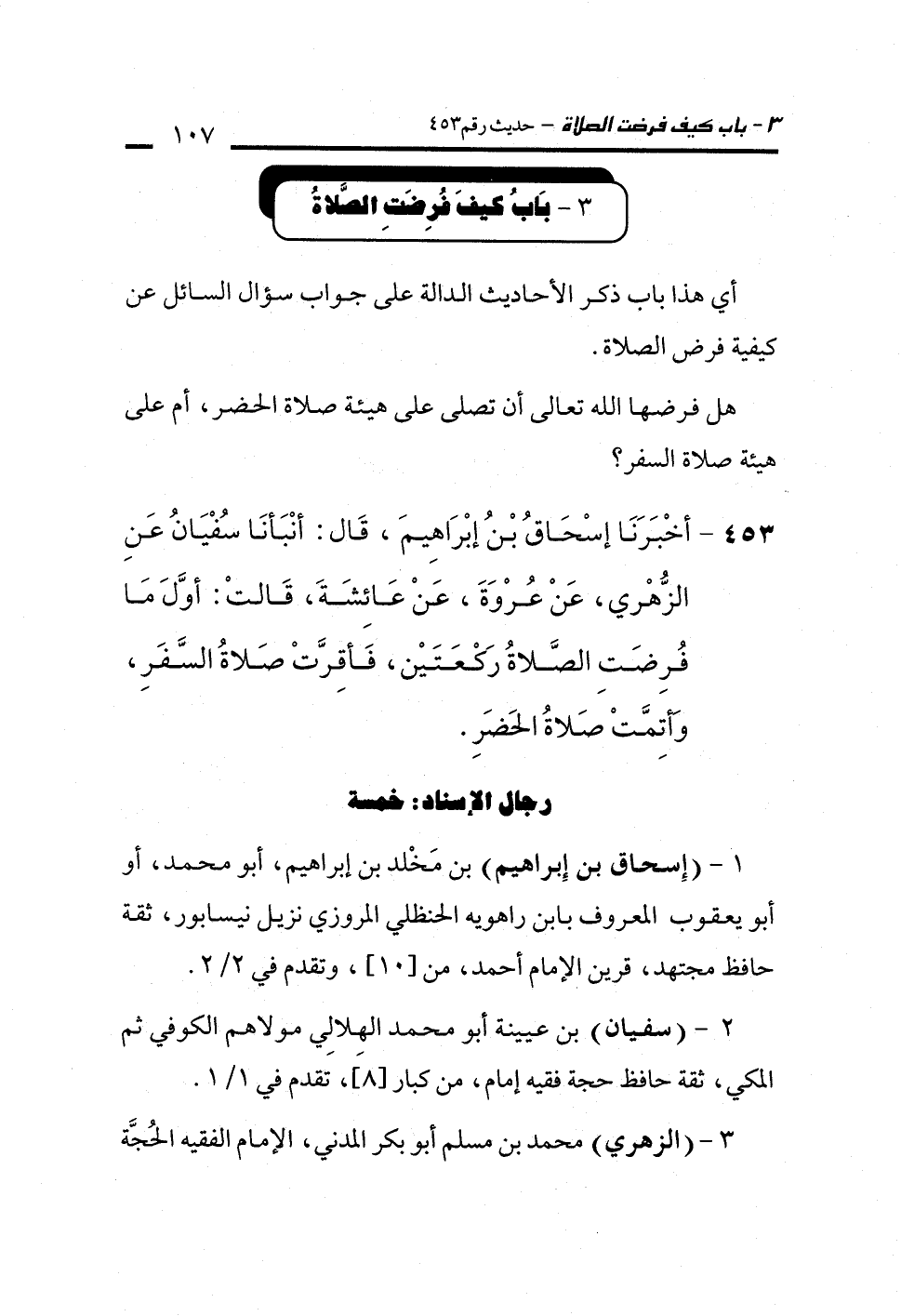 453 - أَخْبَرَنَا إِسْحَاقُ بْنُ إِبْرَاهِيمَ، قَالَ: أَنْبَأَنَا سُفْيَانُ، عَنِ الزُّهْرِيِّ، عَنْ عُرْوَةَ، عَنْ عَائِشَةَ، قَالَتْ: أَوَّلَ مَا فُرِضَتِ الصَّلاَةُ رَكْعَتَيْنِ، فَأُقِرَّتْ صَلاَةُ السَّفَرِ، وَأُتِمَّتْ صَلاَةُ الْحَضَرِ.