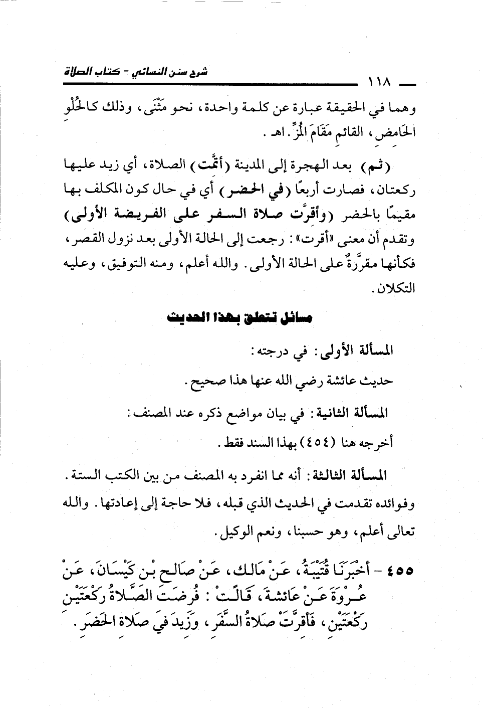 455 - أَخْبَرَنَا قُتَيْبَةُ، عَنْ مَالِكٍ، عَنْ صَالِحِ بْنِ كَيْسَانَ، عَنْ عُرْوَةَ، عَنْ عَائِشَةَ، قَالَتْ: فُرِضَتِ الصَّلاَةُ رَكْعَتَيْنِ رَكْعَتَيْنِ، فَأُقِرَّتْ صَلاَةُ السَّفَرِ، وَزِيدَ فِي صَلاَةِ الْحَضَرِ.
