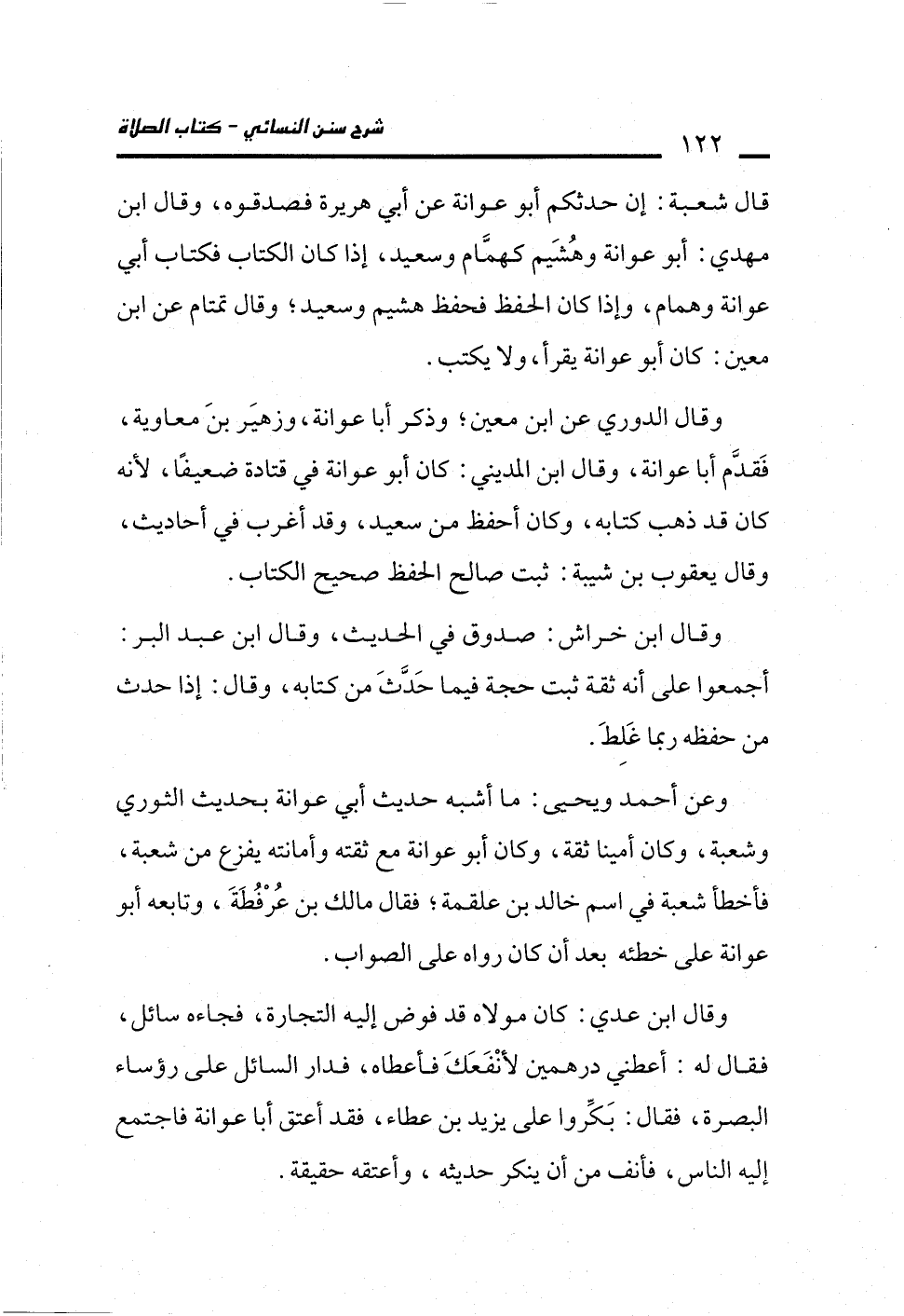 وعن أحمد ويحيى: ما أشبه حديث أبي عوانة بحديث الثوري وشعبة، وكان أمينا ثقة، وكان أبو عوانة مع ثقته وأمانته يفزع من شعبة، فأخطأ شعبة في اسم خالد بن علقمة، فقال مالك بن عُرْفُطَةَ، وتابعه أبو عوانة على خطئه بعد أن كان رواه على الصواب.