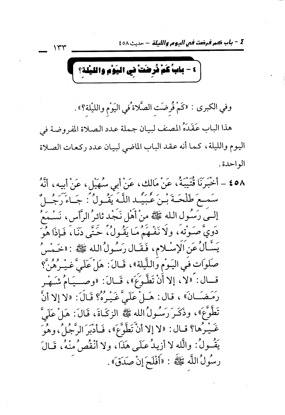 458 - أَخْبَرَنَا قُتَيْبَةُ، عَنْ مَالِكِ بْنِ أَنَسٍ، عَنْ أَبِي سُهَيْلٍ، عَنْ أَبِيهِ، أَنَّهُ سَمِعَ طَلْحَةَ بْنَ عُبَيْدِ اللهِ يَقُولُ: جَاءَ رَجُلٌ إِلَى رَسُولِ اللهِ - صلى الله عليه وسلم - مِنْ أَهْلِ نَجْدٍ ثَائِرَ الرَّأْسِ، نَسْمَعُ دَوِيَّ صَوْتِهِ، وَلاَ نَفْهَمُ مَا يَقُولُ، حَتَّى دَنَا، فَإِذَا هُوَ يَسْأَلُ عَنِ الإِسْلاَمِ، فَقَالَ رَسُولُ اللهِ - صلى الله عليه وسلم -: "خَمْسُ صَلَوَاتٍ فِي الْيَوْمِ وَاللَّيْلَةِ". قَالَ: هَلْ عَلَيَّ غَيْرُهُنَّ؟ قَالَ: "لاَ إِلاَّ أَنْ تَطَّوَّعَ". قَالَ: "وَصِيَامُ شَهْرِ رَمَضَانَ". قَالَ: هَلْ عَلَيَّ غَيْرُهُ؟ قَالَ: "لَا إِلاَّ أَنْ تَطَّوَّعَ". وَذَكَرَ لَهُ رَسُولُ اللهِ - صلى الله عليه وسلم - الزَّكَاةَ، قَالَ: هَلْ عَلَيَّ غَيْرُهَا؟ قَالَ: "لَا إِلاَّ أَنْ تَطَّوَّعَ"، فَأَدْبَرَ الرَّجُلُ، وَهُوَ يَقُولُ: وَاللَّهِ لاَ أَزِيدُ عَلَى هَذَا، وَلاَ أَنْقُصُ مِنْهُ. قَالَ رَسُولُ اللهِ - صلى الله عليه وسلم -: "أَفْلَحَ إِنْ صَدَقَ".