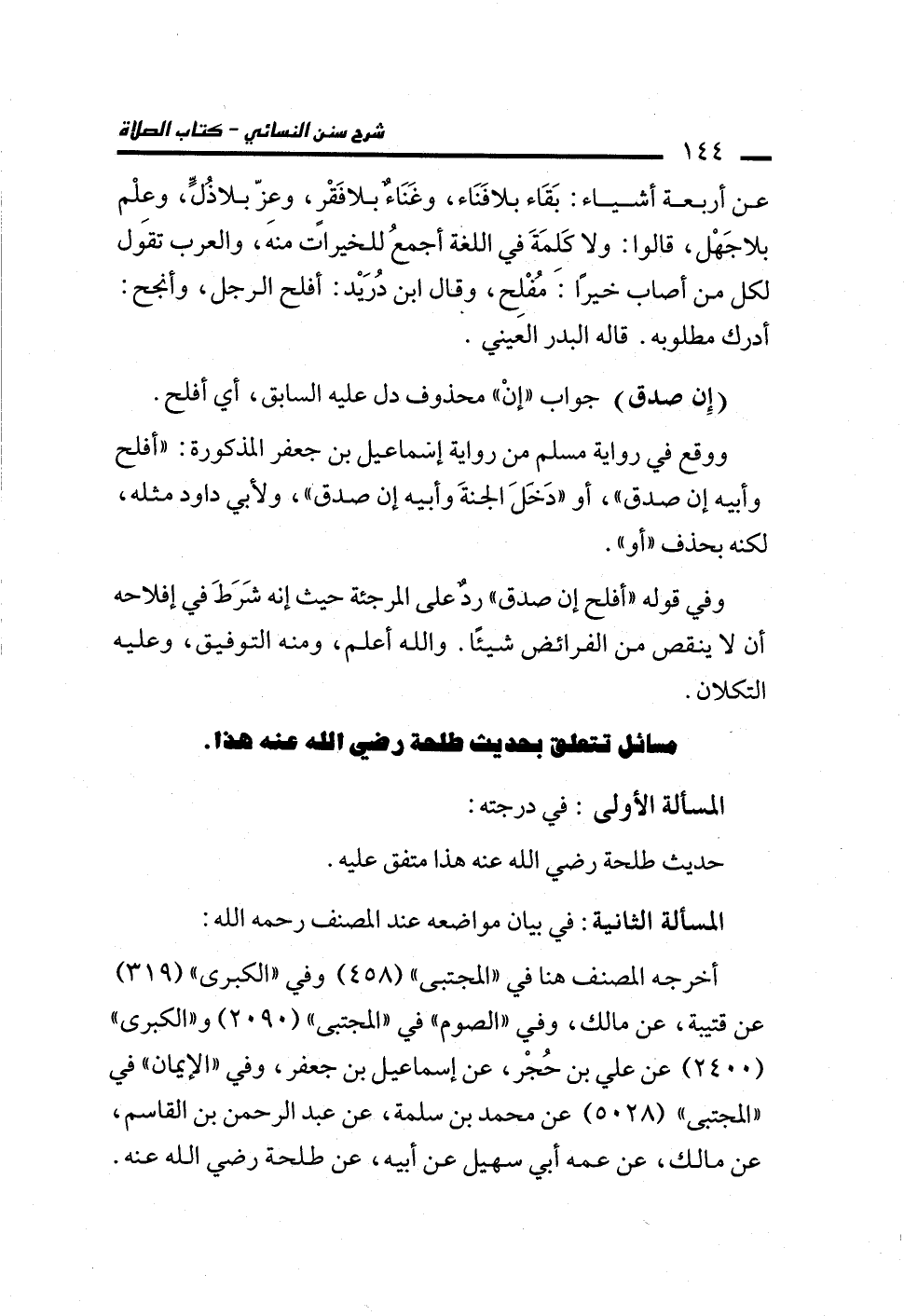 مسائل تتعلق بحديث طلحة رضي الله عنه هذا.