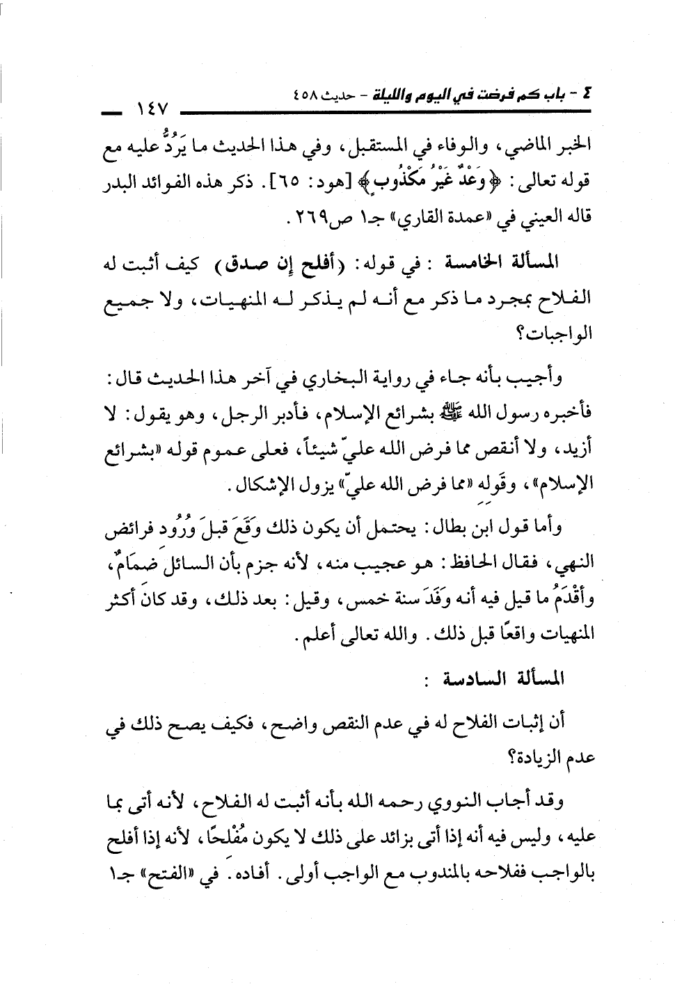وقد أجاب النووي رحمه الله بأنه أثبت له الفلاح، لأنه أتى بما عليه، وليس فيه أنه إذا أتى بزائد على ذلك لا يكون مُفْلِحًا، لأنه إذا أفلح بالواجب ففلاحه بالمندوب مع الواجب أولى. أفاده. في "الفتح" جـ 1