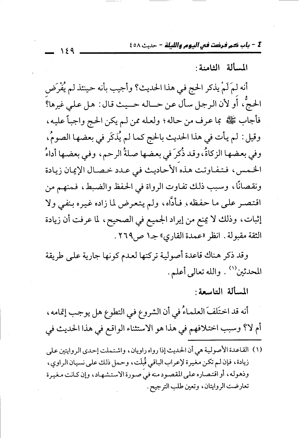 أنه لمَ لَمْ يذكر الحج في هذا الحديث؟ وأجيب بأنه حينئذ لم يُفْرَضِ الحجُّ، أَو لأن الرجل سأل عن حاله حيث قال: هل علي غيرها؟ فأجاب - صلى الله عليه وسلم - بما عرف من حاله؛ ولعله ممن لم يكن الحج واجبًا عليه، وقيل: لم يأت في هذا الحديث بالحج كما لم يُذكَر في بعضها الصومُ، وفي بعضها الزكاةُ، وقد ذُكرَ في بعضها صلةُ الرحم، وفي بعضها أداءُ الخمس، فتفاوتت هذه الأحاديث في عدد خصال الإيمان زيادة ونقصانًا، وسبب ذلك تفاوت الرواة في الحفظ والضبط، فمنهم من اقتصر على ما حفظه،. فأدَّاه، ولم يتعرض لما زاده غيره بنفي ولا إثبات، وذلك لا يمنع من إيراد الجميع في الصحيح، لما عرفت أن زيادة الثقة مقبولة. انظر "عمدة القاري" جـ 1 ص 269.