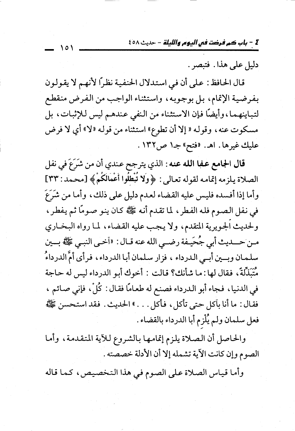 قال الحافظ: على أن في استدلال الحنفية نظرًا لأنهم لا يقولون بفرضية الإتمام، بل بوجوبه، واستثناء الواجب من الفرض منقطع لتباينهما، وأيضًا فإن الاستثناء من النفي عندهم ليس للإثبات، بل مسكوت عنه، وقوله "إلا أن تطوع" استثناء من قوله "لا" أي لا فرض عليك غيرها. اهـ. "فتح" جـ 1 ص 132.