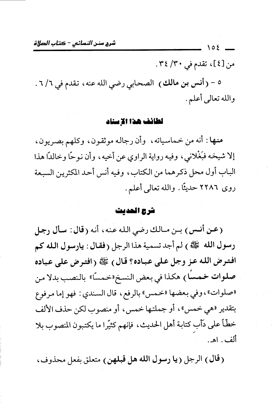 (عن أنس) بن مالك رضي الله عنه، أنه (قال: سأل رجل رسول الله - صلى الله عليه وسلم -) لم أجد تسمية هذا الرجل (فقال: يا رسول الله كم افترض الله عز وجل على عباده؟ قال) - صلى الله عليه وسلم - (افترض على عباده صلوات خمسًا) هكذا في بعض النسخ "خمسًا" بالنصب بدلا من "صلوات"، وفي بعضها "خمس" بالرفع، قال السندي: فهو إما مرفوع بتقدير "هي خمس"، أو جملتها خمس، أو منصوب لكن حذف الألف