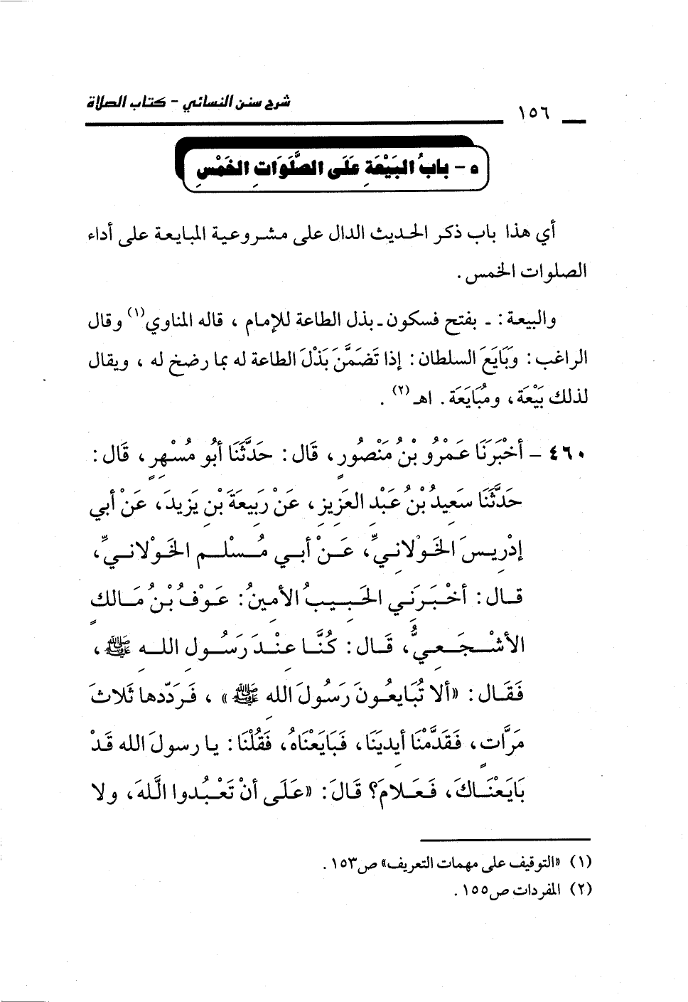 460 - أَخْبَرَنَا عَمْرُو بْنُ مَنْصُورٍ، قَالَ: حَدَّثَنَا أَبُو مُسْهِرٍ، قَالَ: حَدَّثَنَا سَعِيدُ بْنُ عَبْدِ الْعَزِيزِ، عَنْ رَبِيعَةَ بْنِ يَزِيدَ، عَنْ أَبِي إِدْرِيسَ الْخَوْلاَنِيِّ، عَنْ أَبِي مُسْلِمٍ الْخَوْلاَنِيِّ، قَالَ: أَخْبَرَنَا الْحَبِيبُ الأَمِينُ: عَوْفُ بْنُ مَالِكٍ الأَشْجَعِيُّ، قَالَ: كُنَّا عِنْدَ رَسُولِ اللهِ - صلى الله عليه وسلم -، فَقَالَ: "أَلاَ تُبَايِعُونَ رَسُولَ اللهِ - صلى الله عليه وسلم -"، فَرَدَّدَهَا ثَلاَثَ مَرَّاتٍ، فَقَدَّمْنَا أَيْدِيَنَا، فَبَايَعْنَاهُ، فَقُلْنَا: يَا رَسُولَ اللهِ قَدْ بَايَعْنَاكَ، فَعَلاَمَ؟ قَالَ: "عَلَى أَنْ تَعْبُدُوا اللهَ، وَلاَ