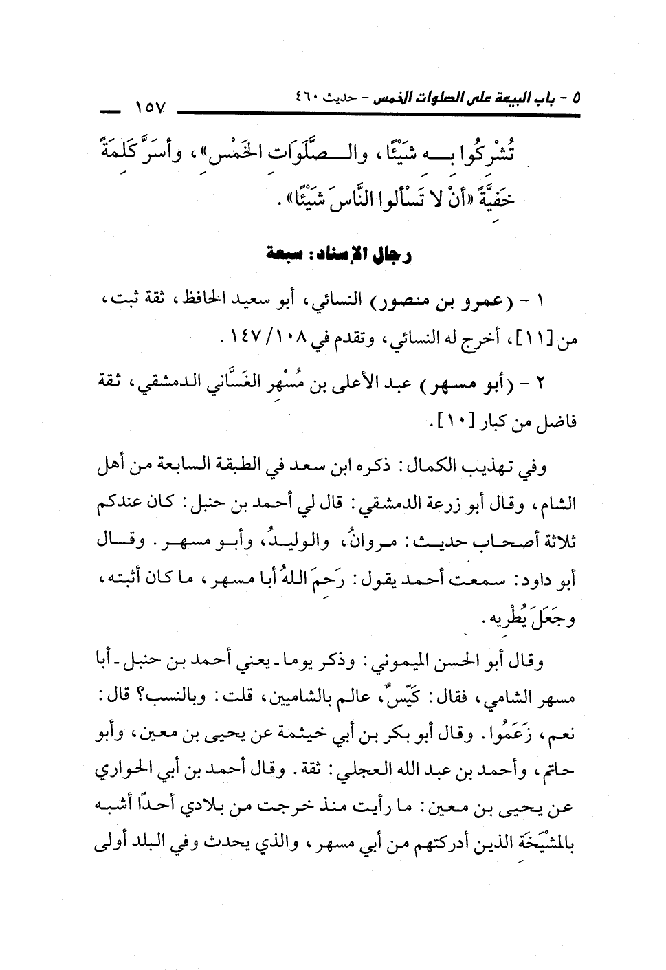 تُشْرِكُوا بِهِ شَيْئًا، وَالصَّلَوَاتِ الْخَمْسِ"، وَأَسَرَّ كَلِمَةً خَفِيَّةً "أَنْ لاَ تَسْأَلُوا النَّاسَ شَيْئًا".