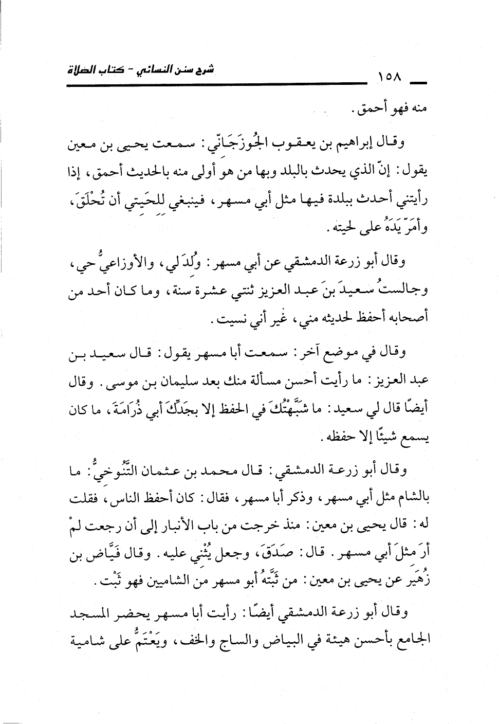 وقال إبراهيم بن يعقوب الجُوزَجَانِّي: سمعت يحيى بن معين يقول: إنّ الذي يحدث بالبلد وبها من هوَ أولى منه بالحديث أحمق، إذا رأيتني أحدث ببلدة فيها مثل أبي مسهر، فينبغي لِلِحَيتي أن تُحْلَقَ، وأمَرّ يَدَهُ على لحيته.