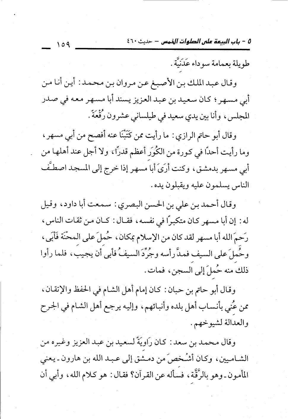 وقال محمد بن سعد: كان رَاوِيَةً لسعيد بن عبد العزيز وغيره من الشاميين، وكان أشْخِصَ من دمشق إلى عبد الله بن هارون -يعني المأمون- وهو بالرَّقَّةِ، فسَأله عن القرآن؟ فقال: هو كلام الله، وأبي أن