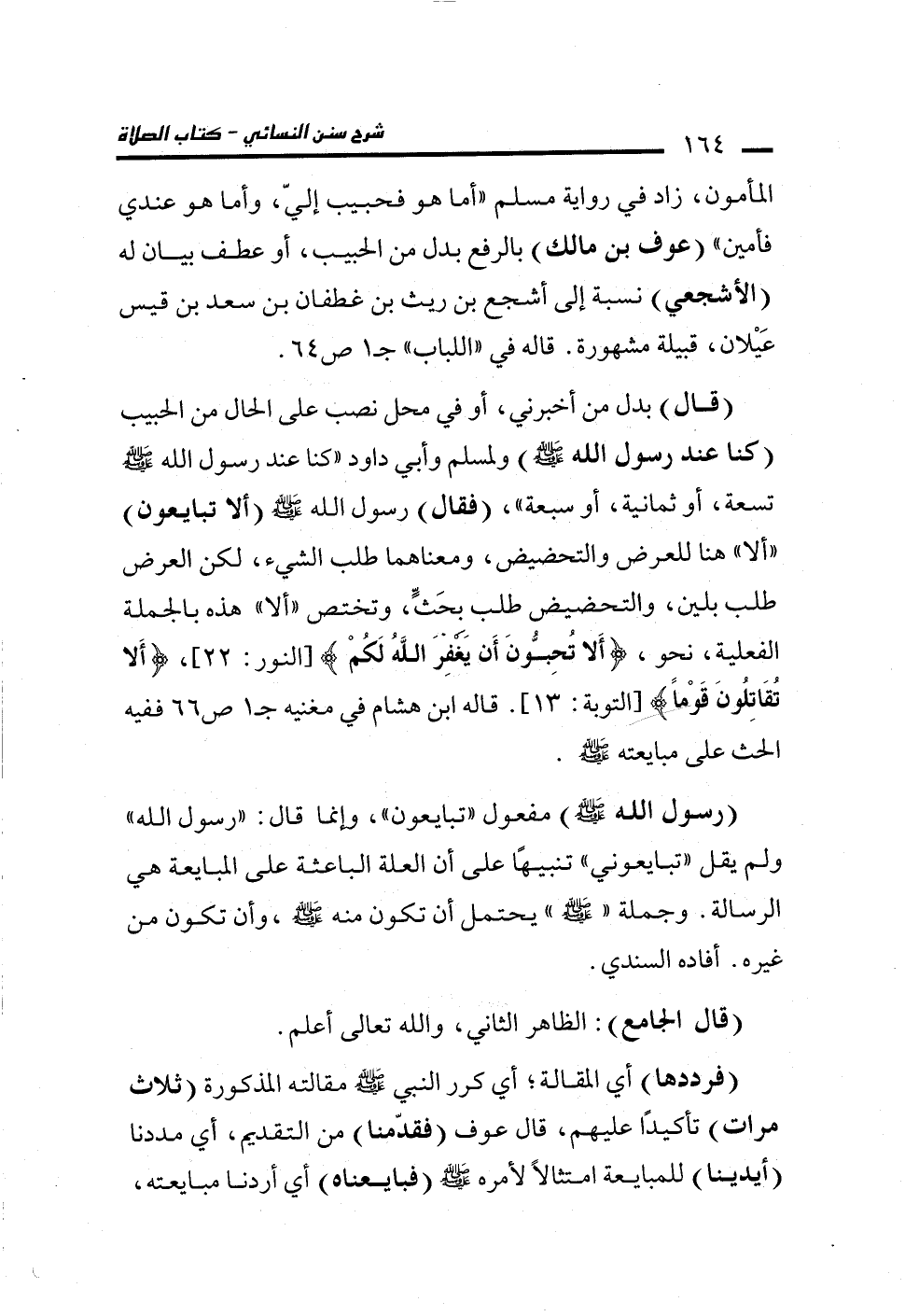 (قال) بدل من أخبرني، أو في محل نصب على الحال من الحبيب (كنا عند رسول الله - صلى الله عليه وسلم -) ولمسلم وأبي داود "كنا عند رسول الله - صلى الله عليه وسلم - تسعة، أو ثمانية، أو سبعة"، (فقال) رسول الله - صلى الله عليه وسلم - (ألا تبايعون) "ألا" هنا للعرض والتحضيض، ومعناهما طلب الشيء، لكن العرض طلب بلين، والتحضيض طلب بحَثٍّ، وتختص "ألا" هذه بالجملة الفعلية، نحو، {أَلَا تُحِبُّونَ أَنْ يَغْفِرَ اللَّهُ لَكُمْ} [النور: 22]، {أَلَا تُقَاتِلُونَ قَوْمًا} [التوبة: 13]. قاله ابن هشام في مغنيه جـ 1 ص 66 ففيه الحث على مبايعته - صلى الله عليه وسلم -.