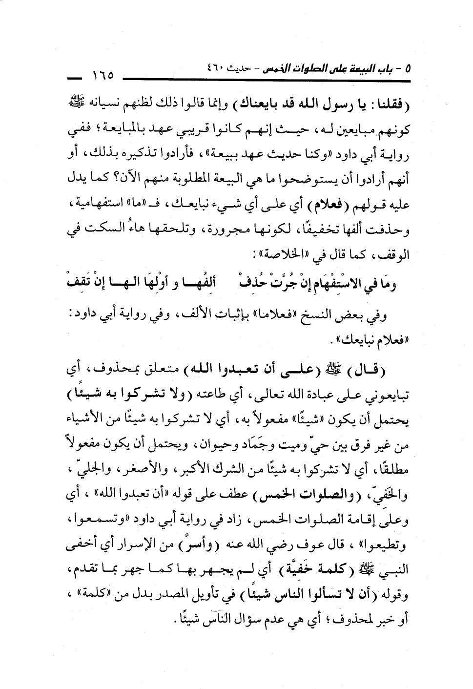 (قال) - صلى الله عليه وسلم - (على أن تعبدوا الله) متعلق بمحذوف، أي تبايعوني على عبادة الله تعالى، أي طاعته (ولا تشركوا به شيئًا) يحتمل أن يكون "شيئًا" مفعولًا به، أي لا تشركوا به شيئًا من الأشياء من غير فرق بين حيّ وميت وجَمَاد وحيوان، ويحتمل أن يكون مفعولًا مطلقًا، أي لا تشركوا به شيئًا من الشرك الأكبر، والأصغر، والجليّ، والخَفيّ، (والصلوات الخمس) عطف على قوله "أن تعبدوا الله"، أي وعلىَ إقامة الصلوات الخمس، زاد في رواية أبي داود "وتسمعوا، وتطيعوا"، قال عوف رضي الله عنه (وأسرَّ) من الإسرار أي أخفى النبي - صلى الله عليه وسلم - (كلمة خَفيَّة) أي لم يجهر بها كما جهر بما تقدم، وقوله (أن لا تسألوا الناس شيئًا) في تأويل المصدر بدل من "كلمة"، أو خبر لمحذوف؛ أي هي عدم سؤال الناس شيئًا.