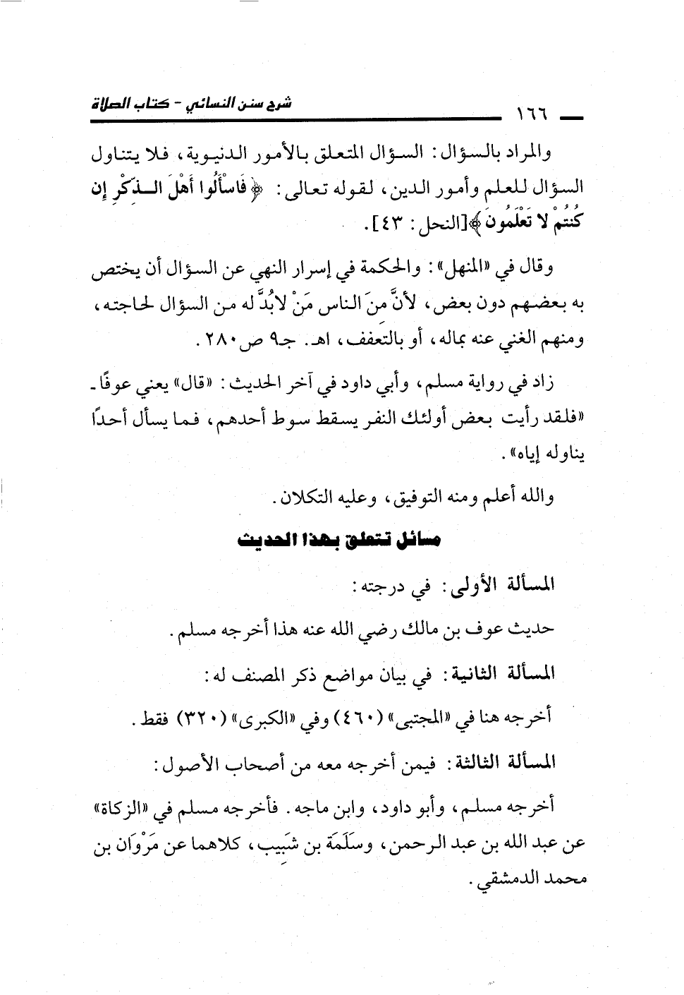 وقال في "المنهل": والحكمة في إسرار النهي عن السؤال أن يختص به بعضهم دون بعض، لأنَّ منَ الناس مَنْ لابُدَّ له من السؤال لحاجته، ومنهم الغني عنه بماله، أو بالتَعفف، اهـ. جـ 9 ص 280.